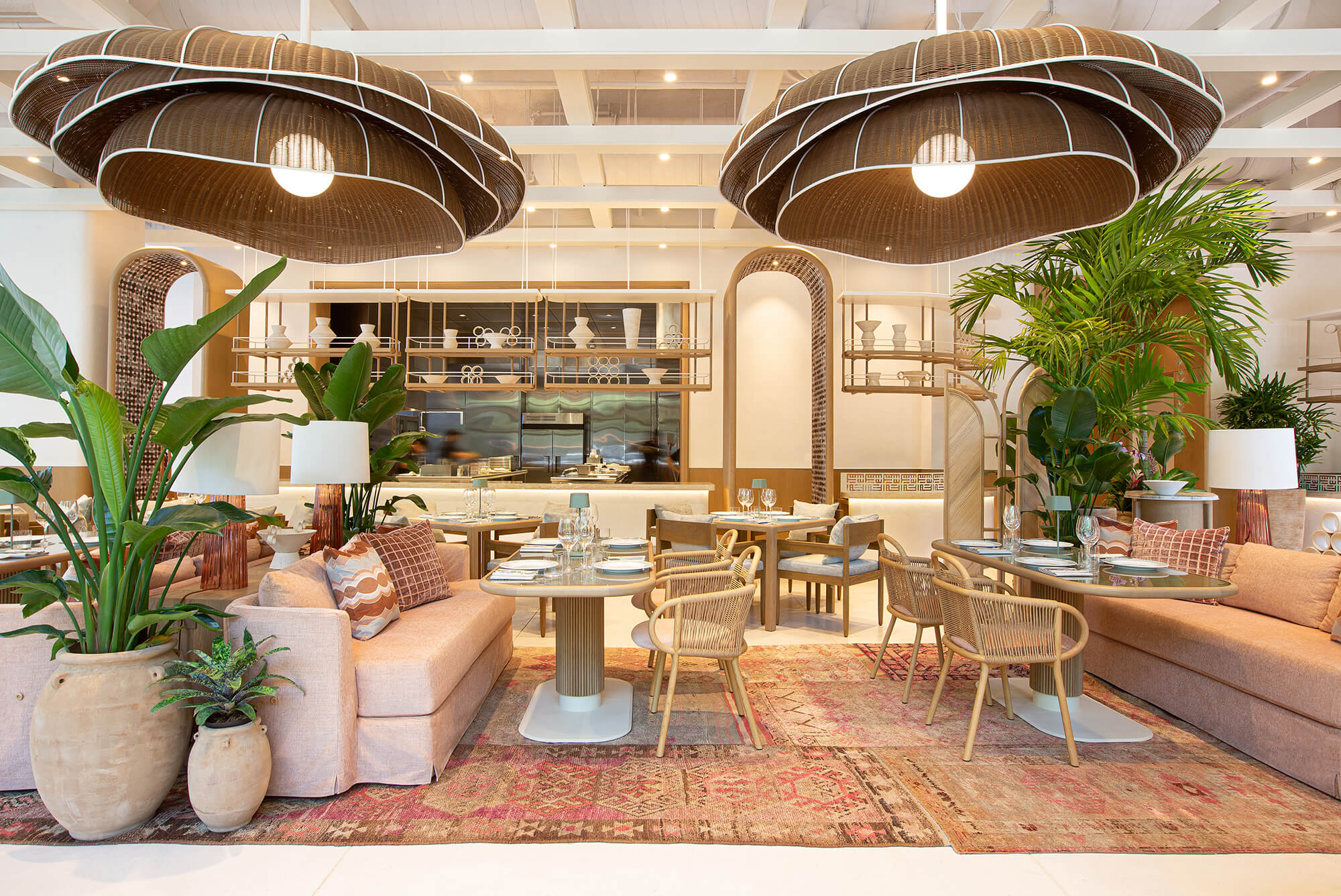 Famed restaurateur and hotelier Charles Khabouth recently opened up a new Amal restaurant in Coconut Grove, Miami. Working with Studio Munge, VISO Lighting design-engineered and fabricated bespoke large-scale fixtures that suspend over the dining area. The organic shape is refined by white trim and rattan that is hand-woven for an eleveated texture.
