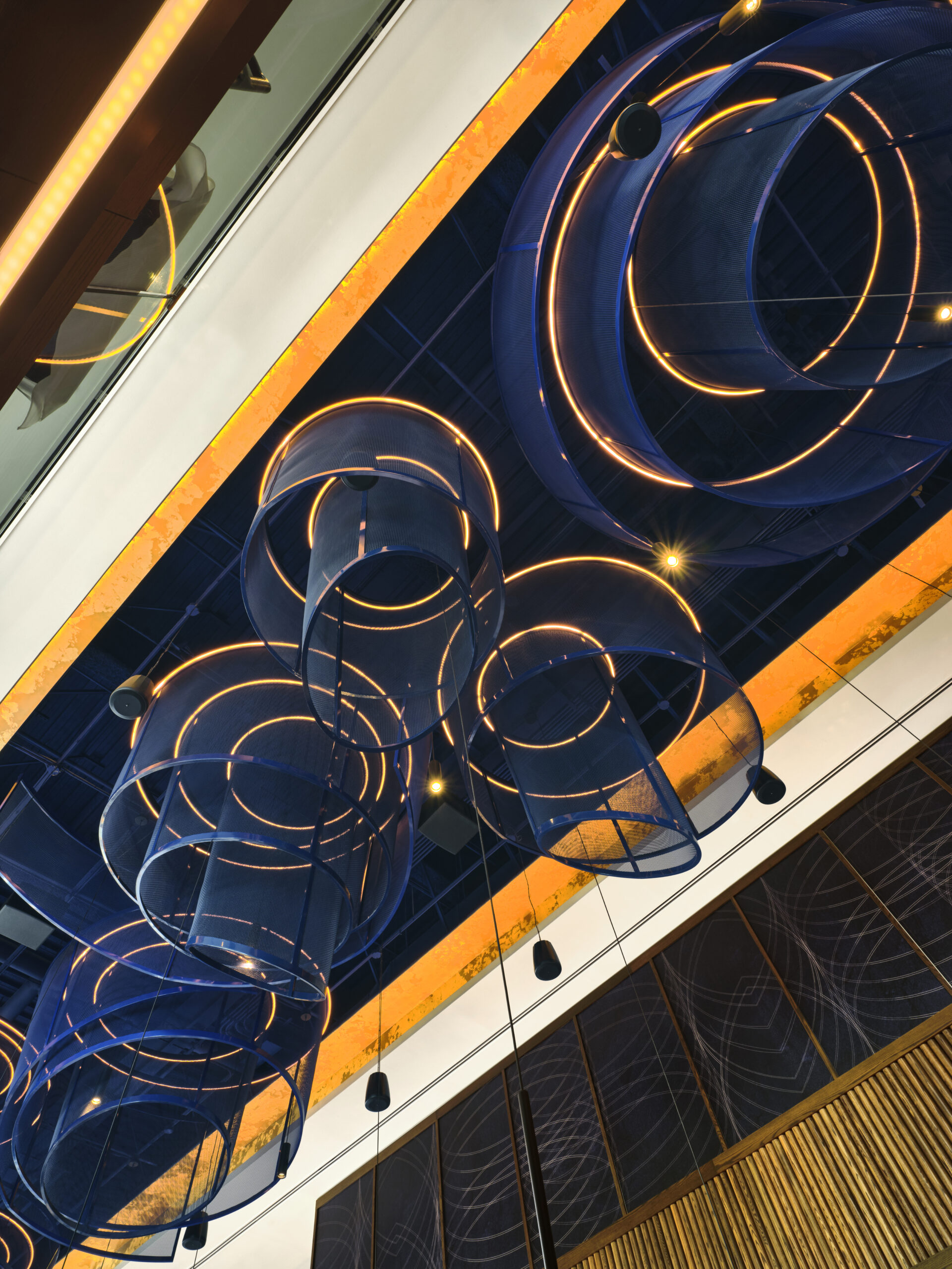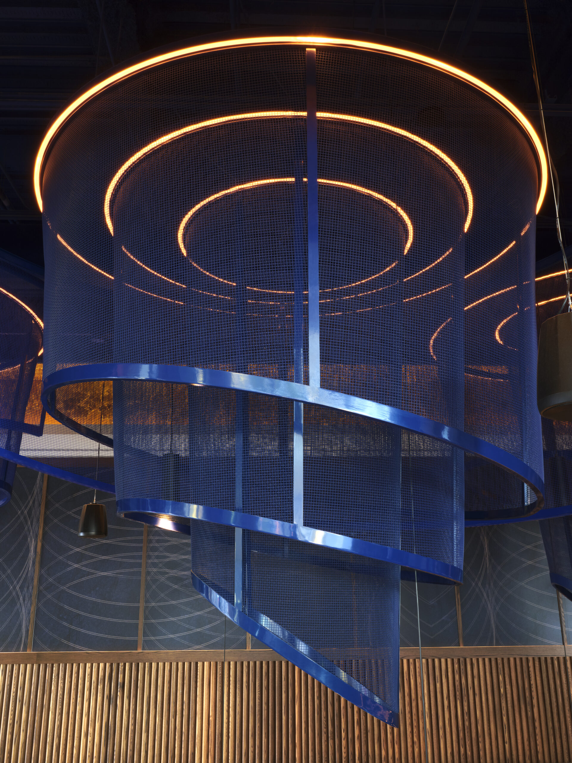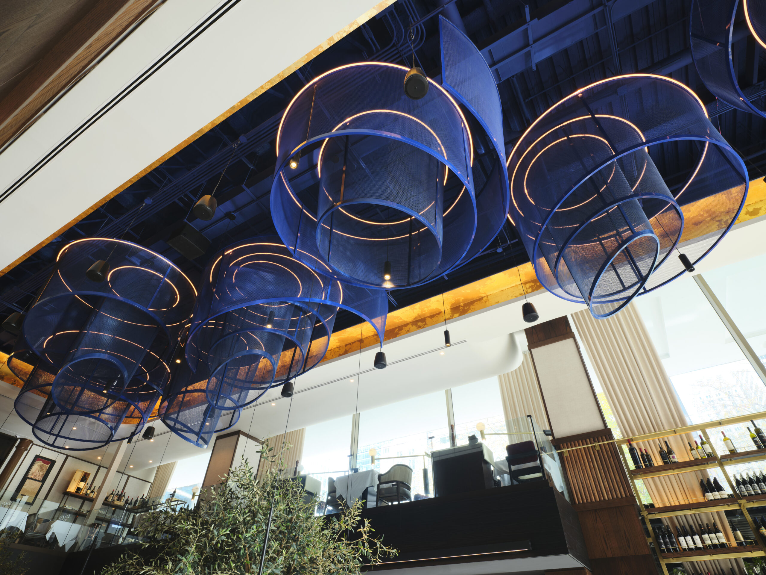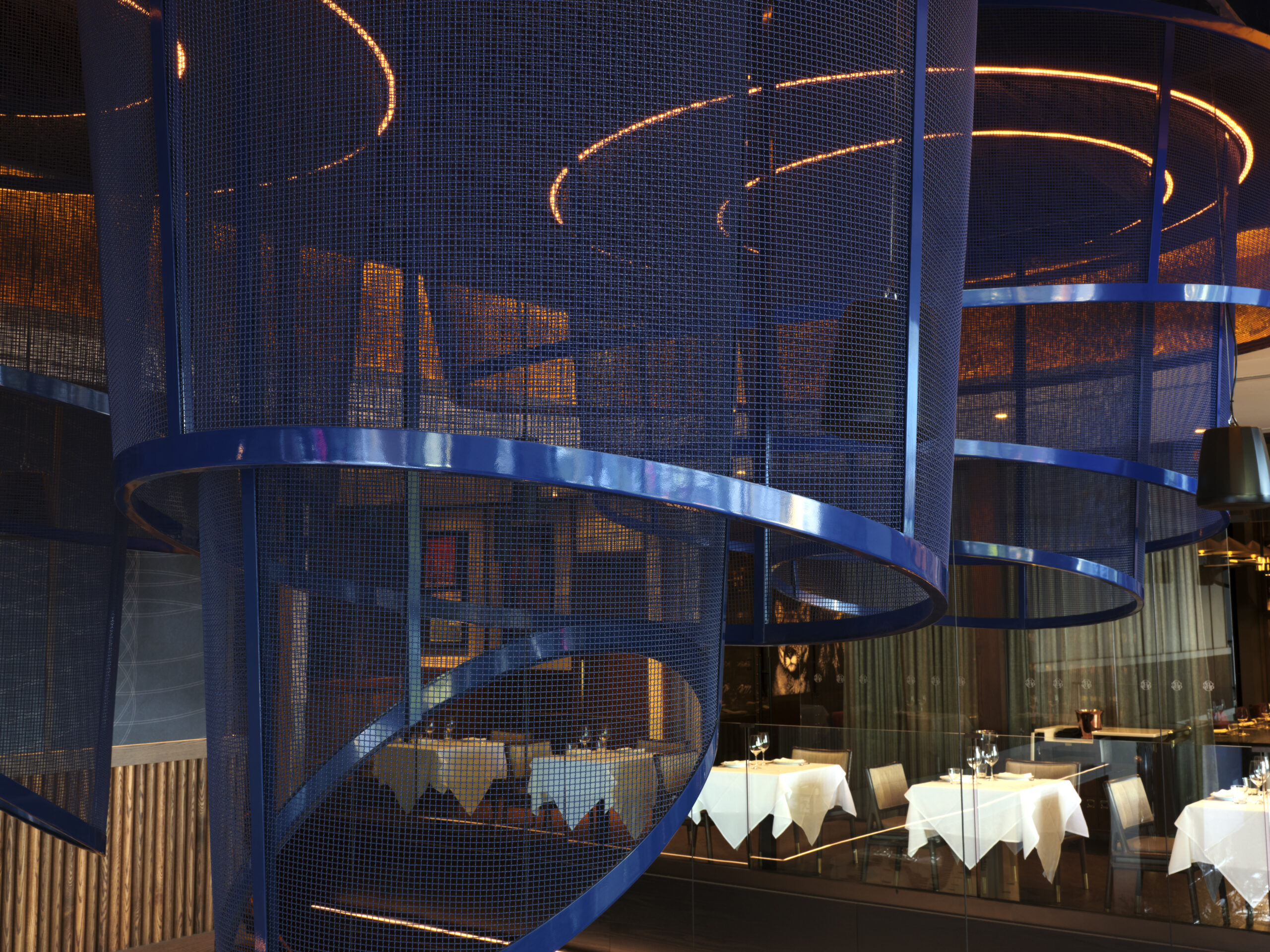 Given the multiple dining areas within the restaurant it was vital the installation be viewed and appreciated at multiple angles; at bar level, viewing the inside gold frames of the circular mesh sculptures, to viewing the blue mesh sides and movement in the structure at mezzanine level.