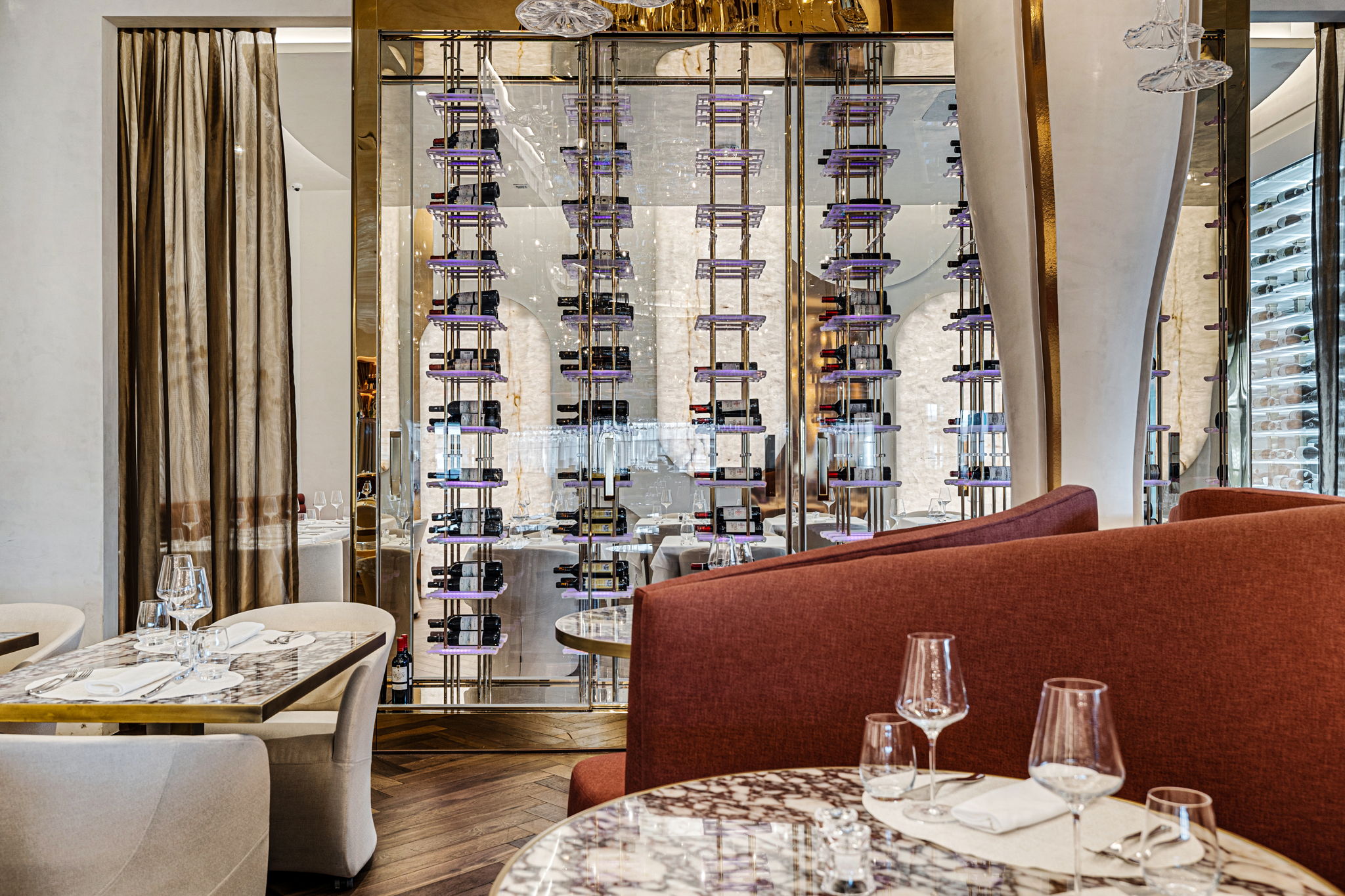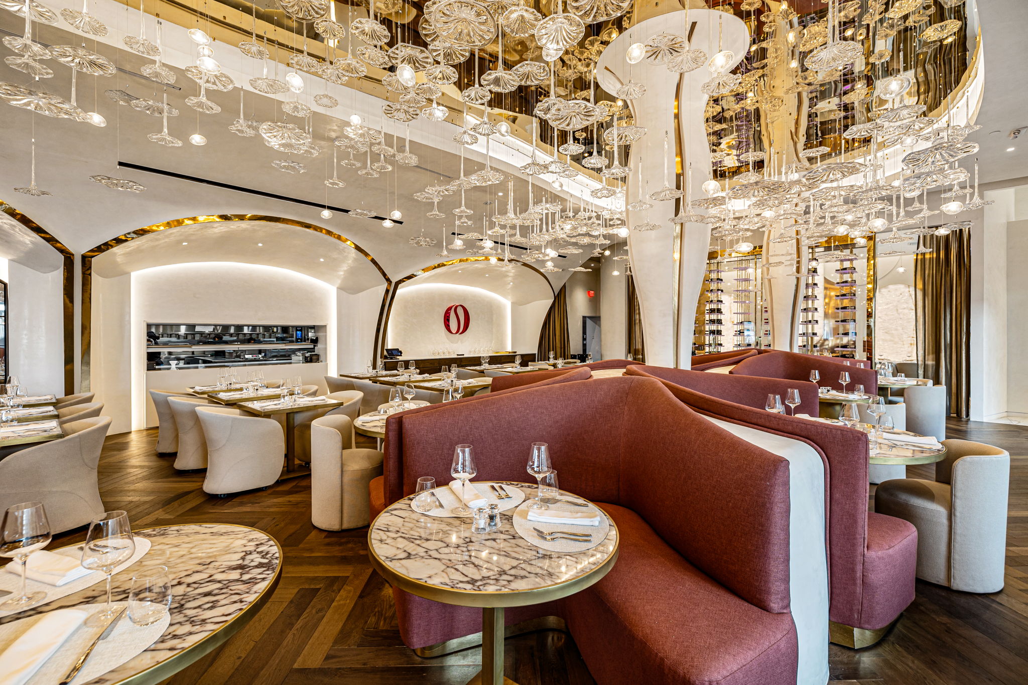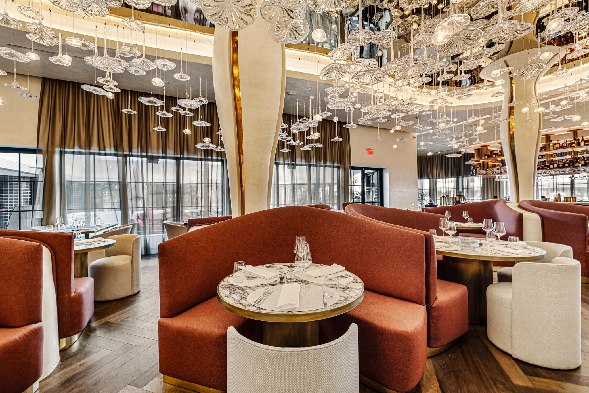 Polished metal features in shades of gold and pink, including mirrored champagne brass-colored arches and the golden horseshoe-shaped bar, Magon notes were the foundational design elements considered.