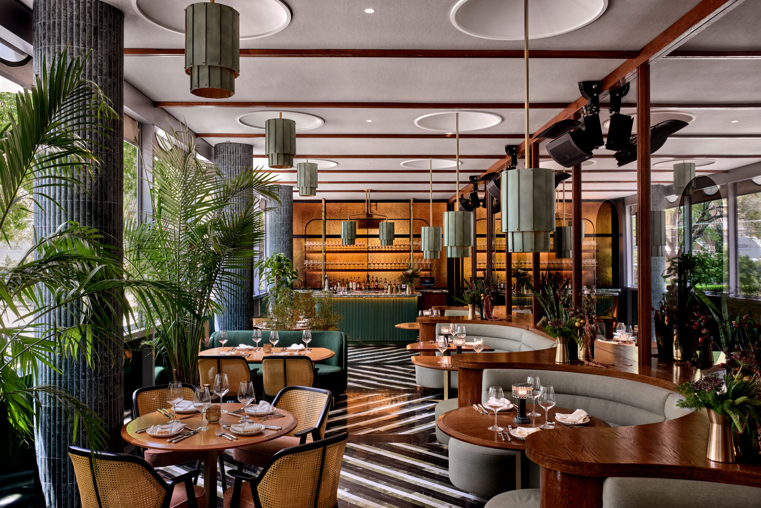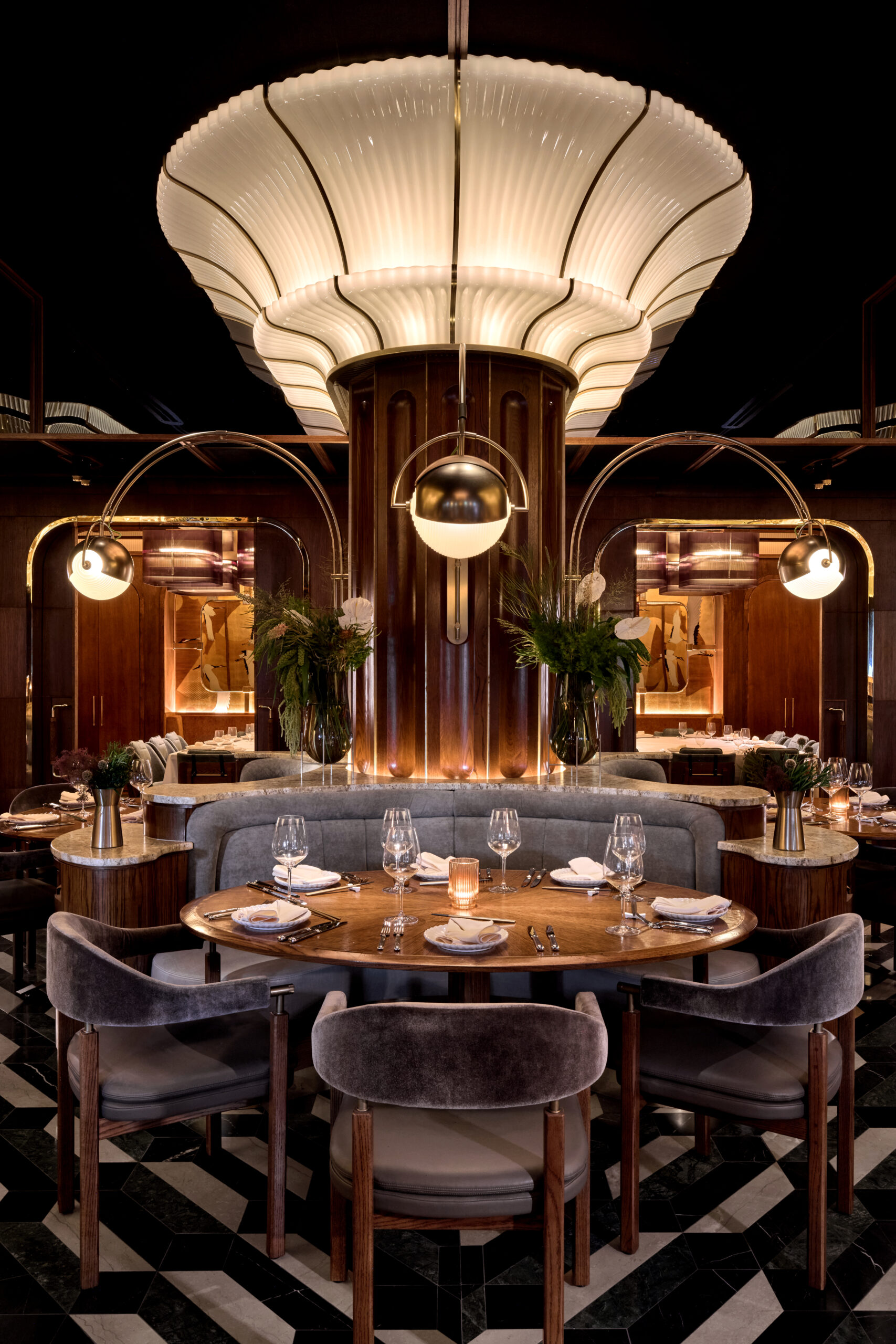 The lavish interiors of Nuri Steakhouse draw inspiration from the Art Deco era, featuring curvaceous forms, soft fabrics, and intricate details in wood, metals, and stones. Traditional Korean celadon ceramics influence the colors and textures throughout the space, adding a timeless elegance.