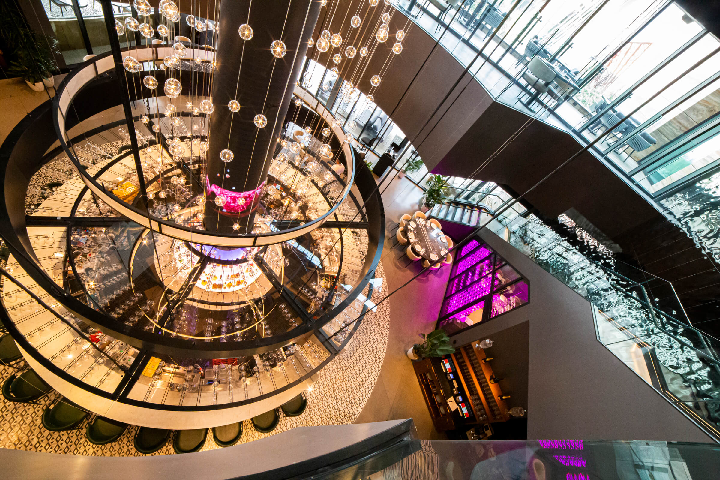 TPG Architecture commissioned VISO to custom design-engineer, manufacture, install and program this one-of-a-kind feature decorative lighting installation for Nusr-Et restaurant in Las Vegas. The custom decorative lighting installation features an LED column, multiple LED panels, rings, and ceiling with the highest pixel quality LED screens, contemporary decorative crystal pendants and DMX controlled LEDs. VISO also designed, engineered, manufactured and installed a custom wine cellar display with DMX technology.