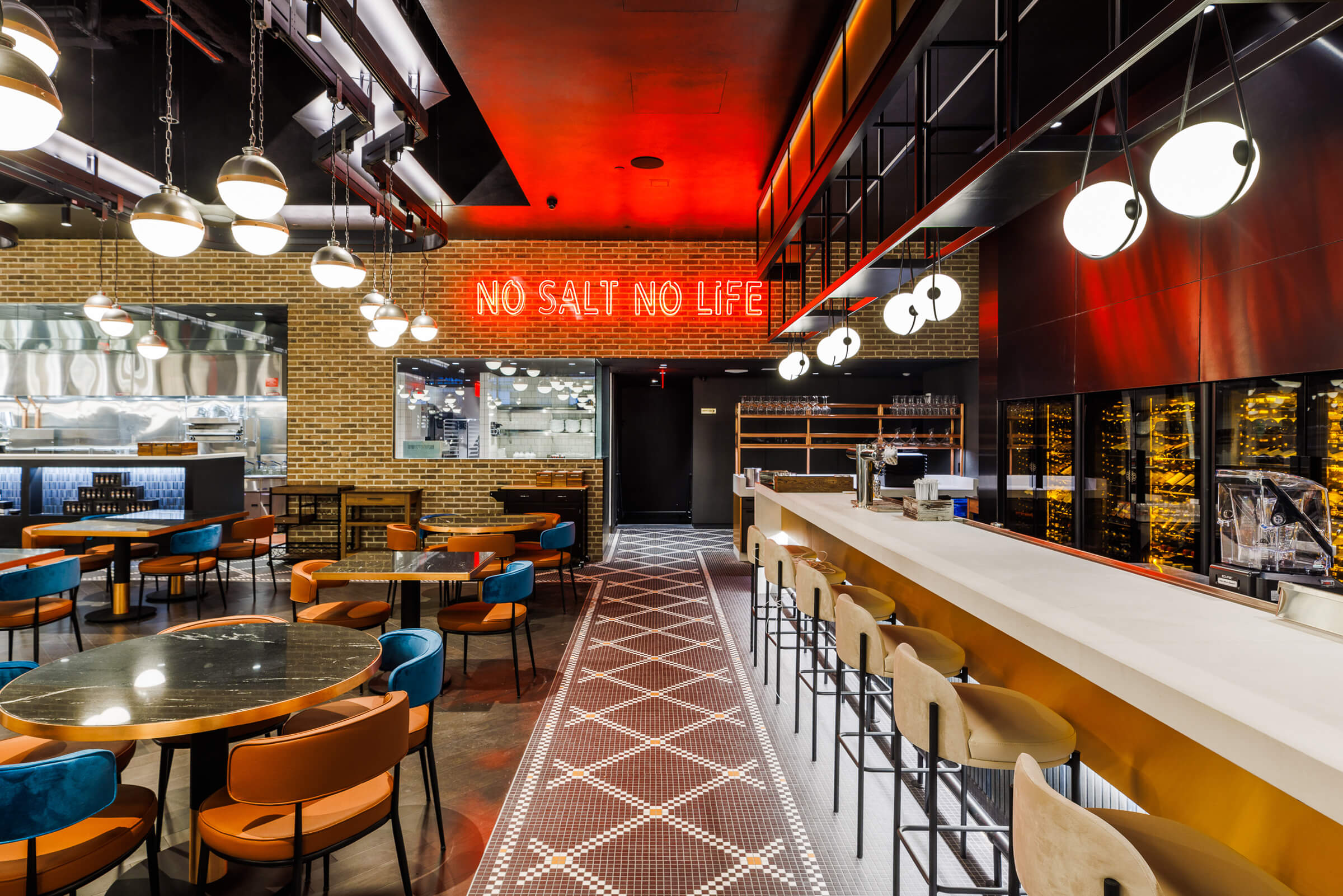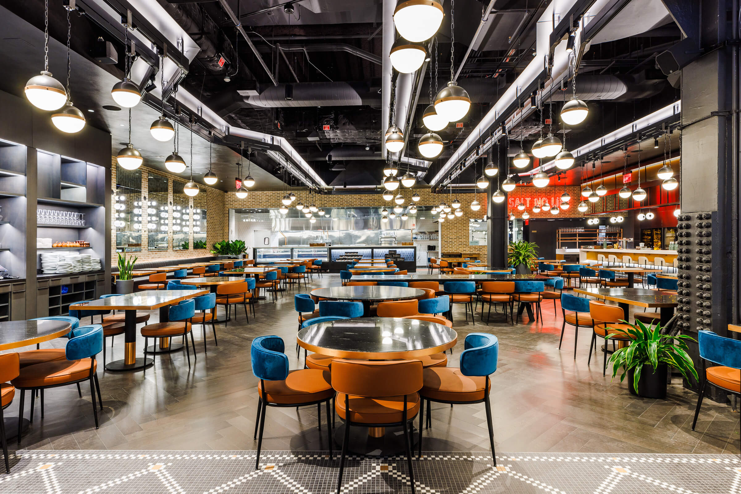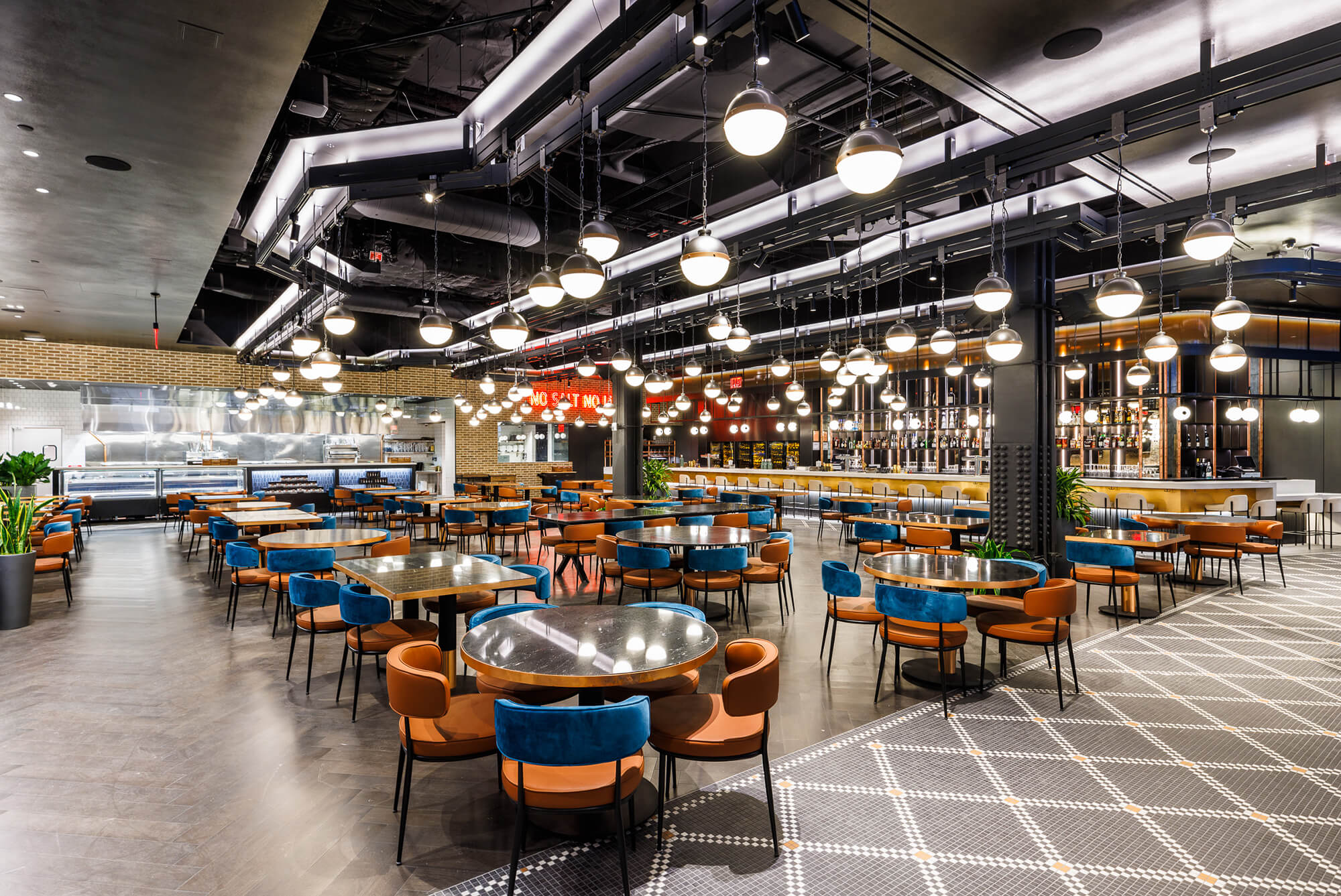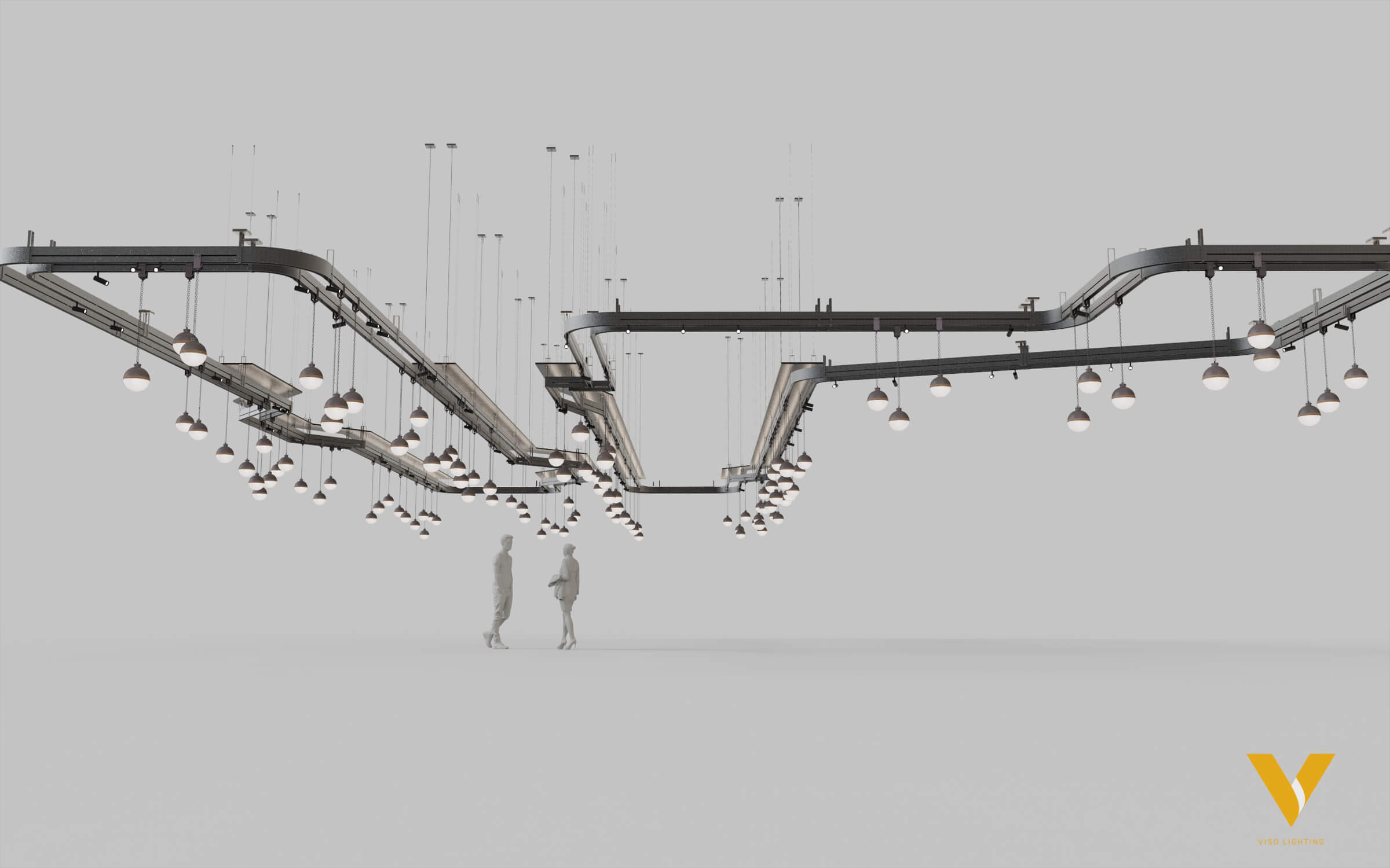 Working with TPG Architecture, VISO design-engineered a custom illuminated pendant rail system for Nusr-Et NYC. Located in the Meatpacking District, this continuous light rail is inspired by its environment, emulating a harmonious flow. Just like a well oiled fabrication plant, this custom fixture embodies operational efficiency, an important aspect of restaurant operations.