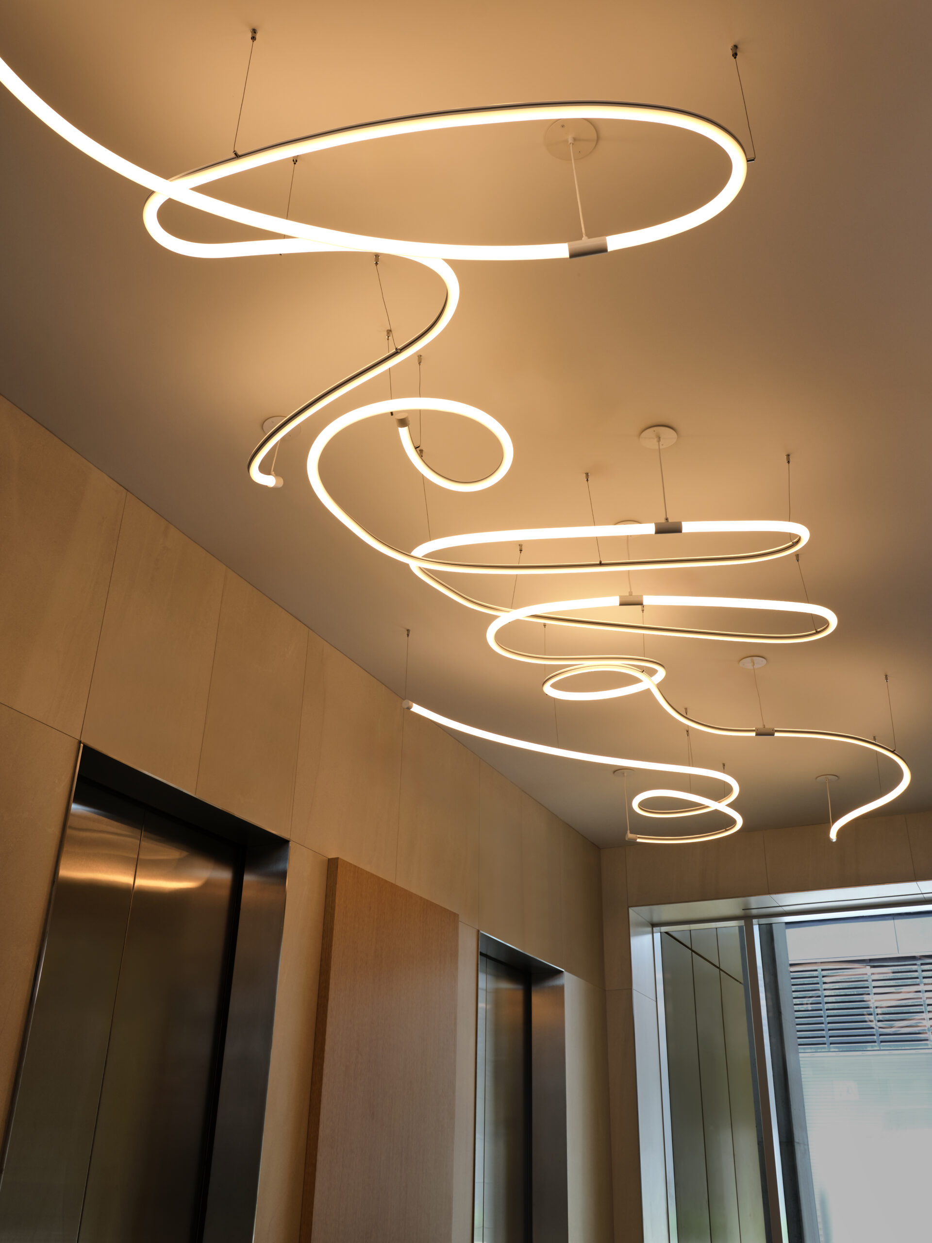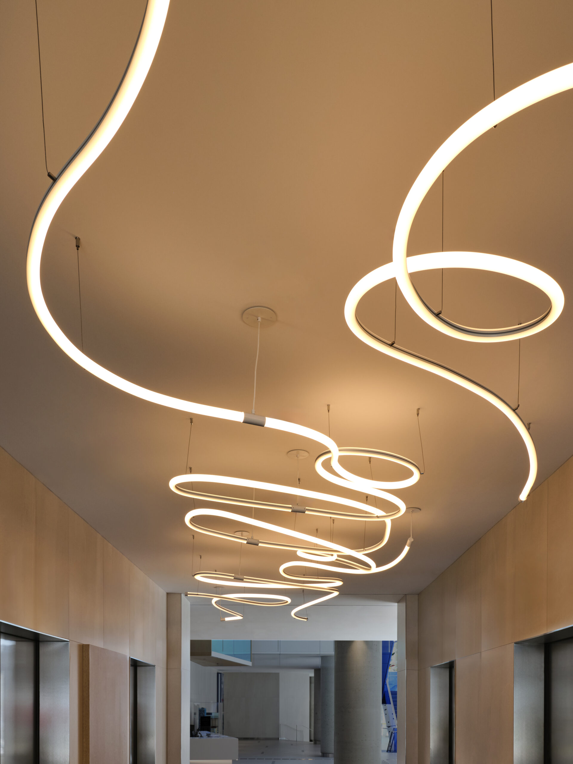 A hanging mobile in front lobby, murals on learning floors that include drawings from patients, rainbow glass framed exit stairwell visible from patient rooms across the street and much more.