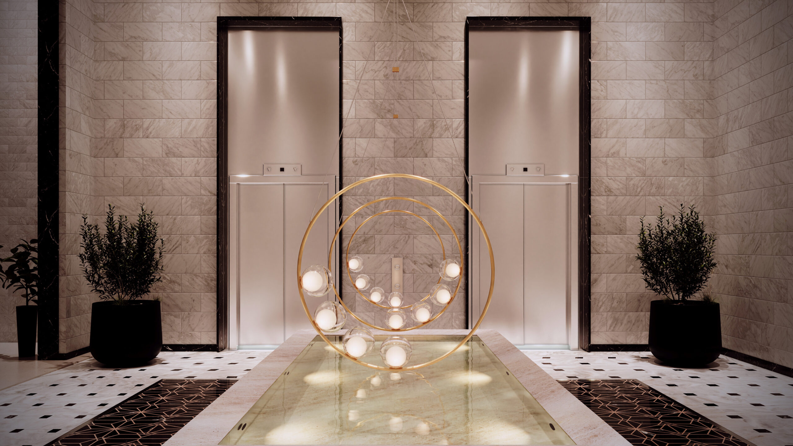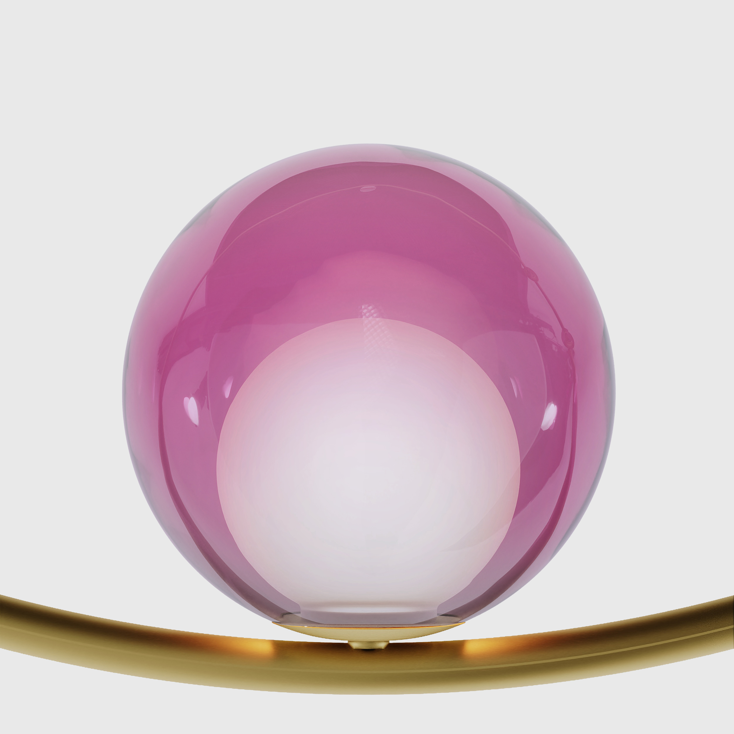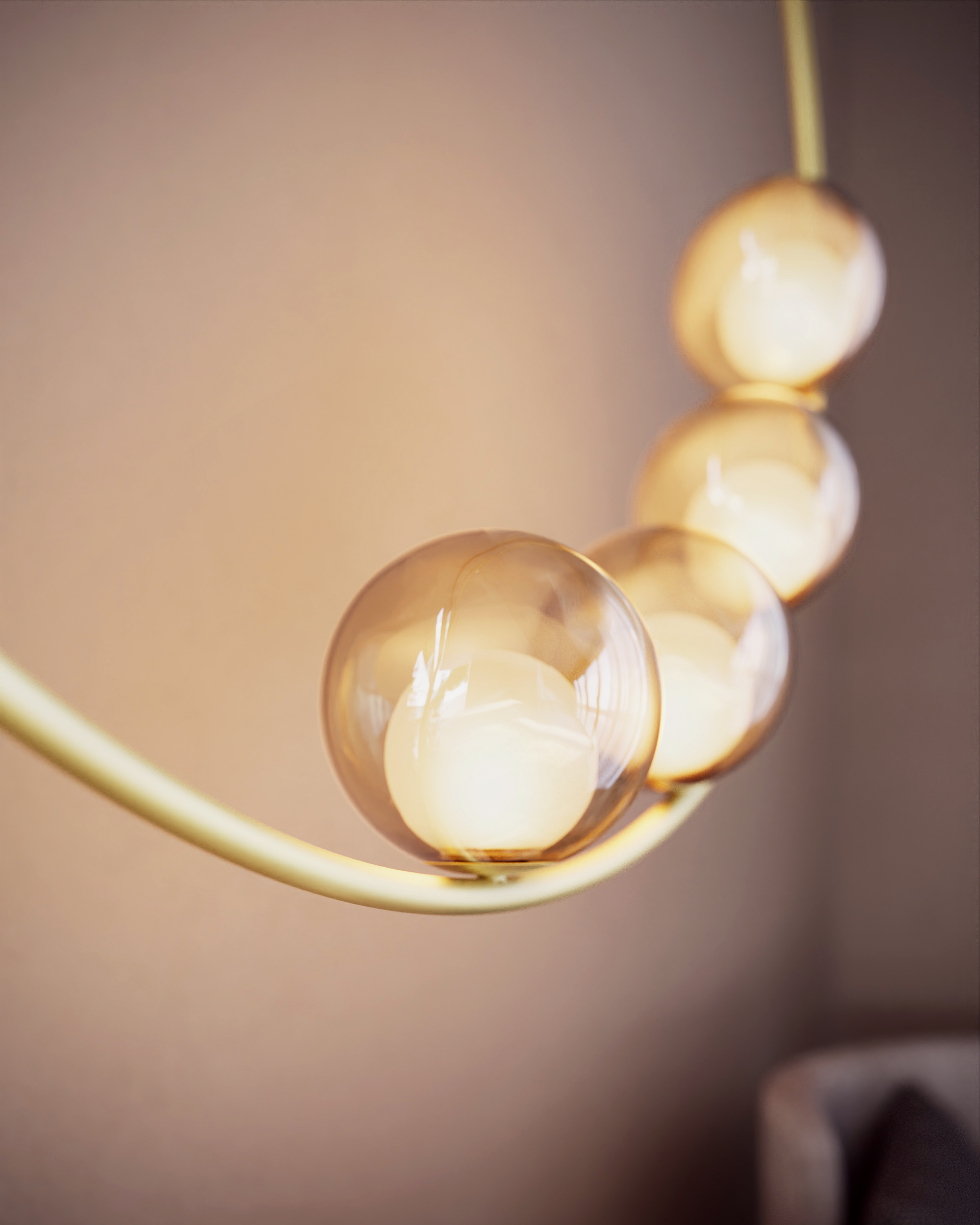 The design features four concentric glass globes, elegantly secured to a golden hoop ring, casting a mesmerizing cascade of light. Each glass globe is interchangeable, offering endless possibilities for customization to match any environment, mood, or occasion, while providing the opportunity for playful color experimentation.