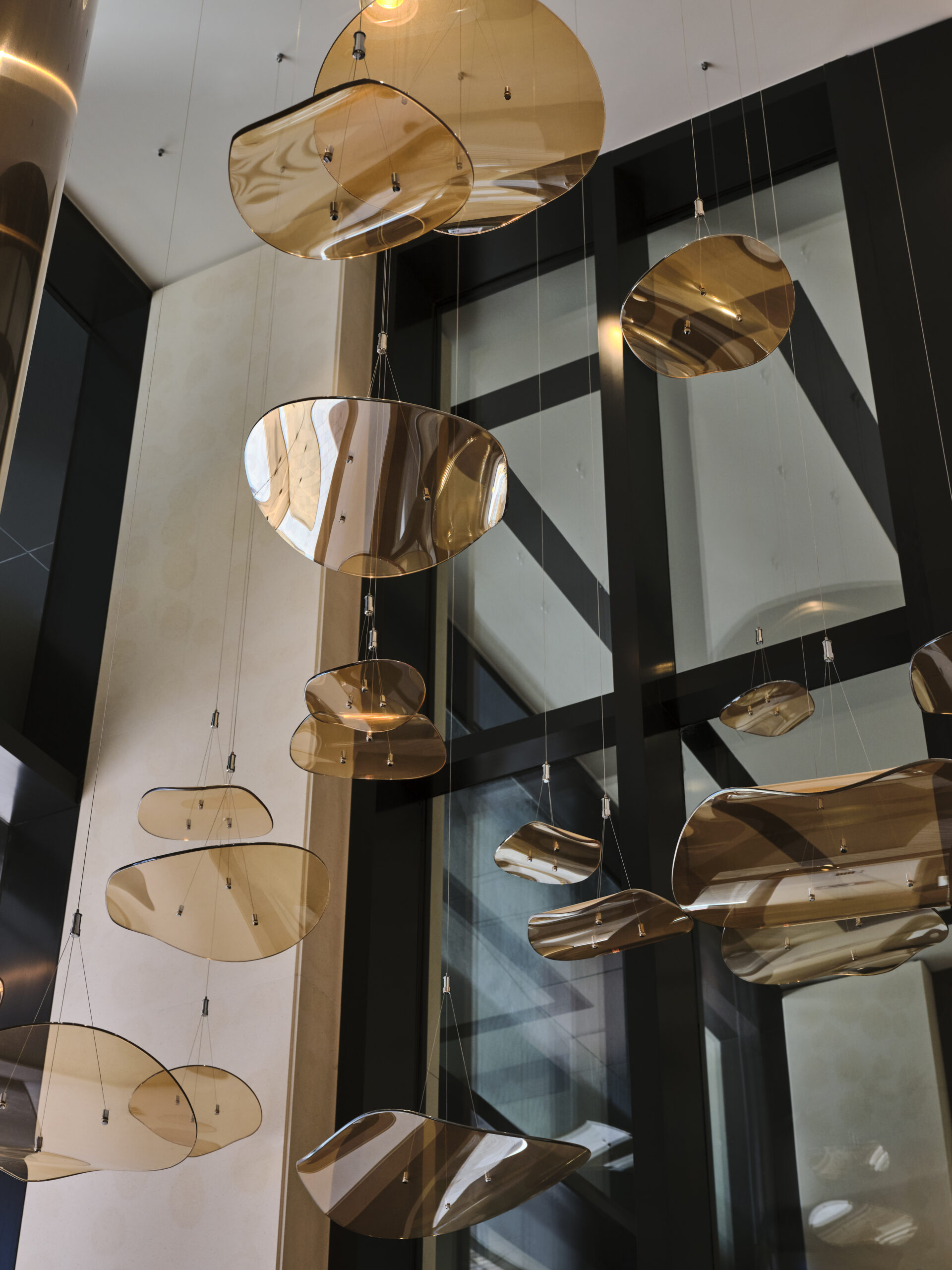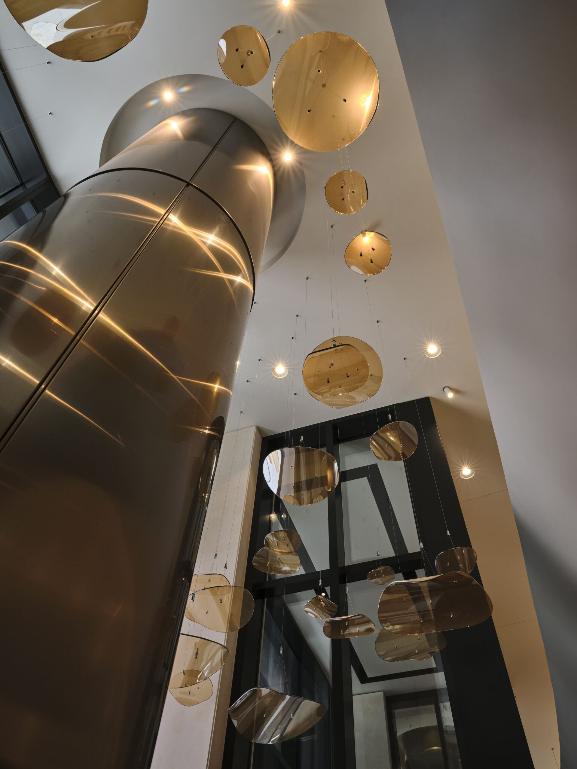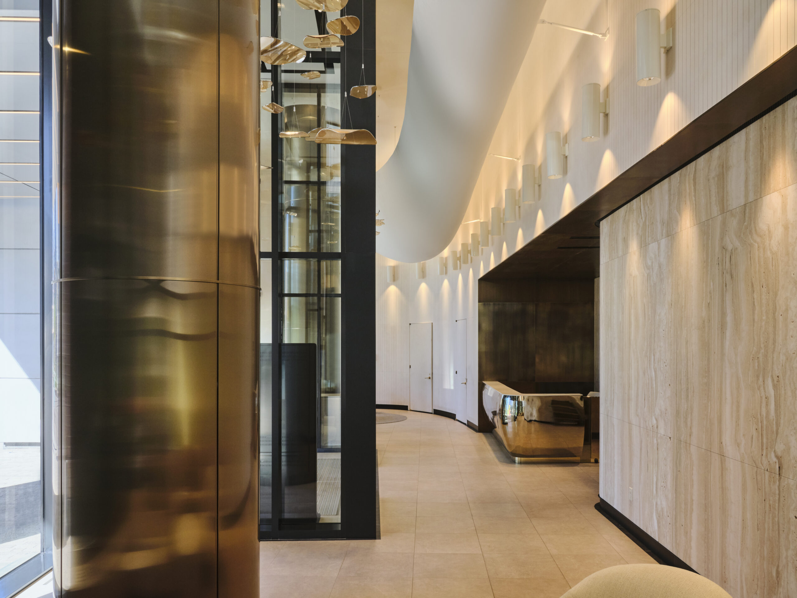 The aim was to create a visually stunning and calming transition from the outside street. Asymmetrical archways and an illuminated bronze collage form a high-end hospitality feel to the space as visitors move toward the living areas.