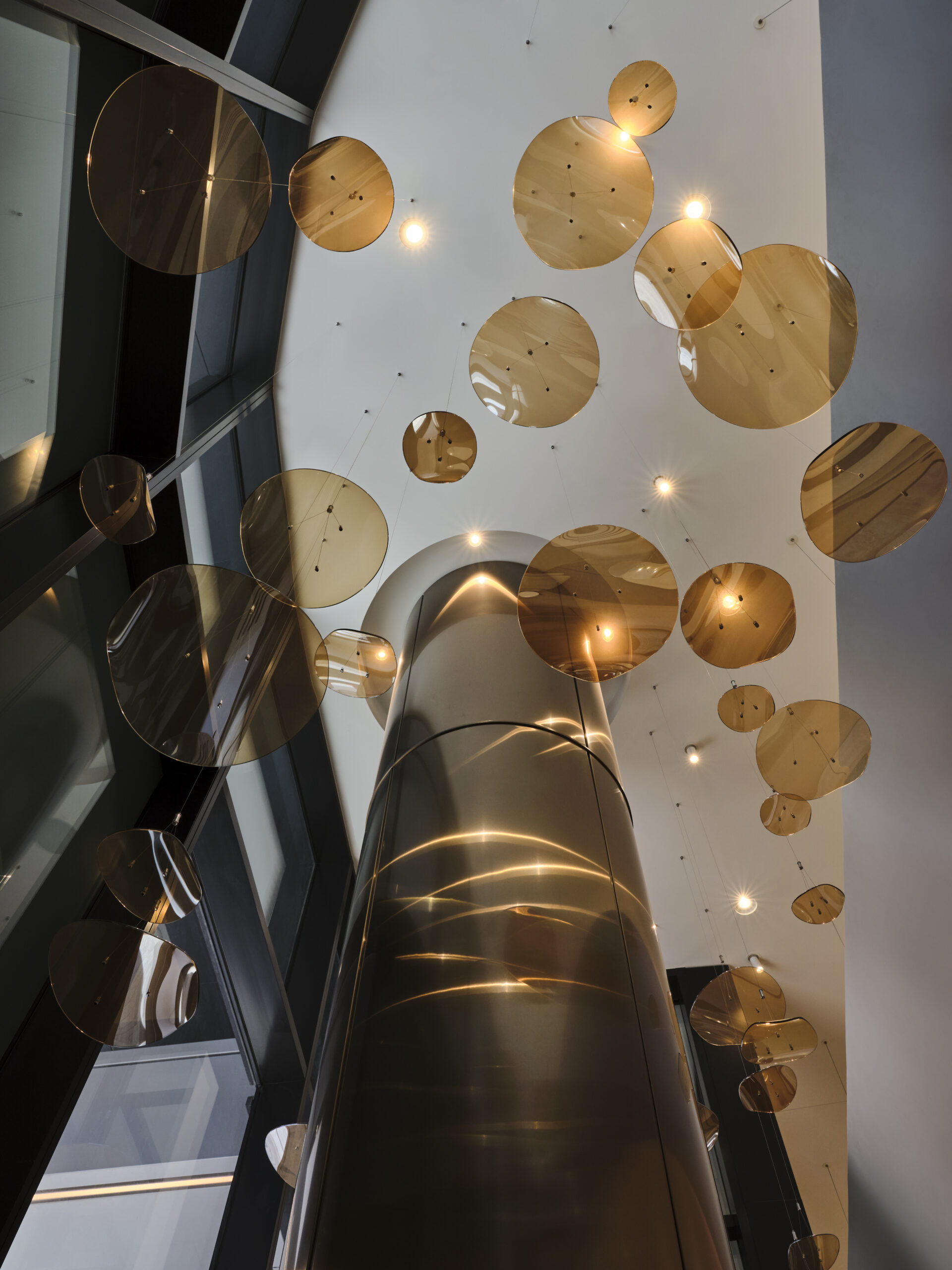 Tridel at The Well, is part of The Well landmark multi-tower development in Toronto. The space is a unique design identity with a focus on texture and organic forms. The entrance features a sculptural droplet-inspired element and rippled glass discs.