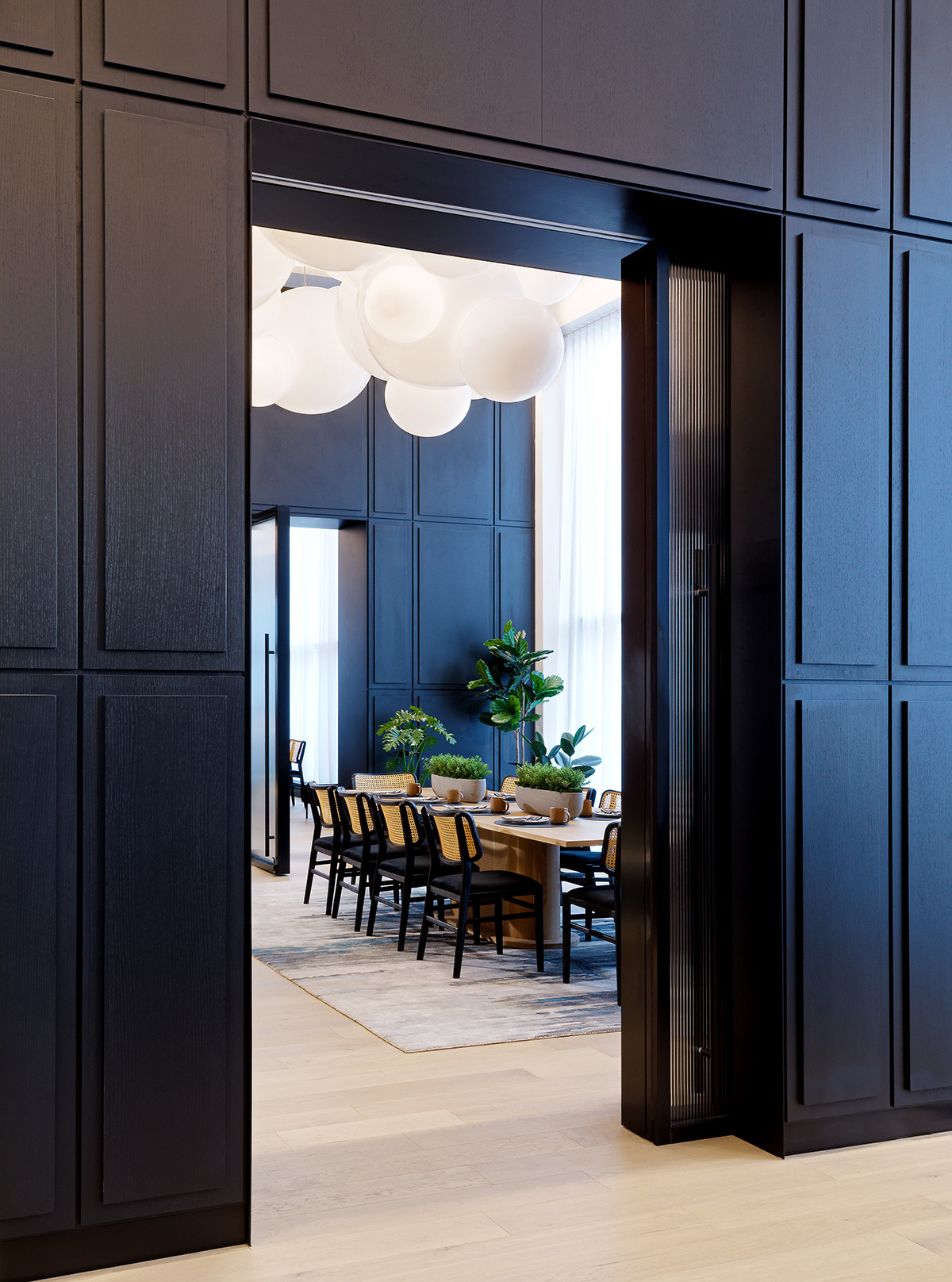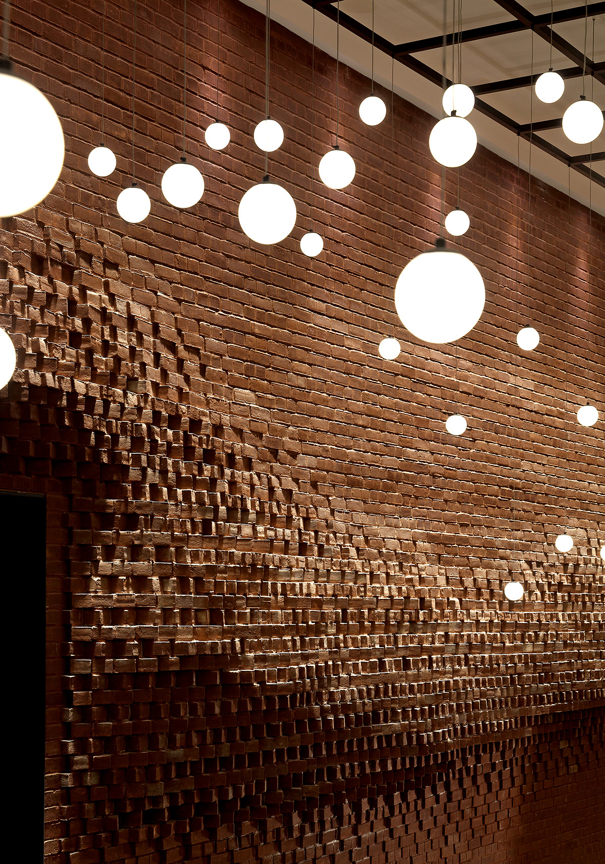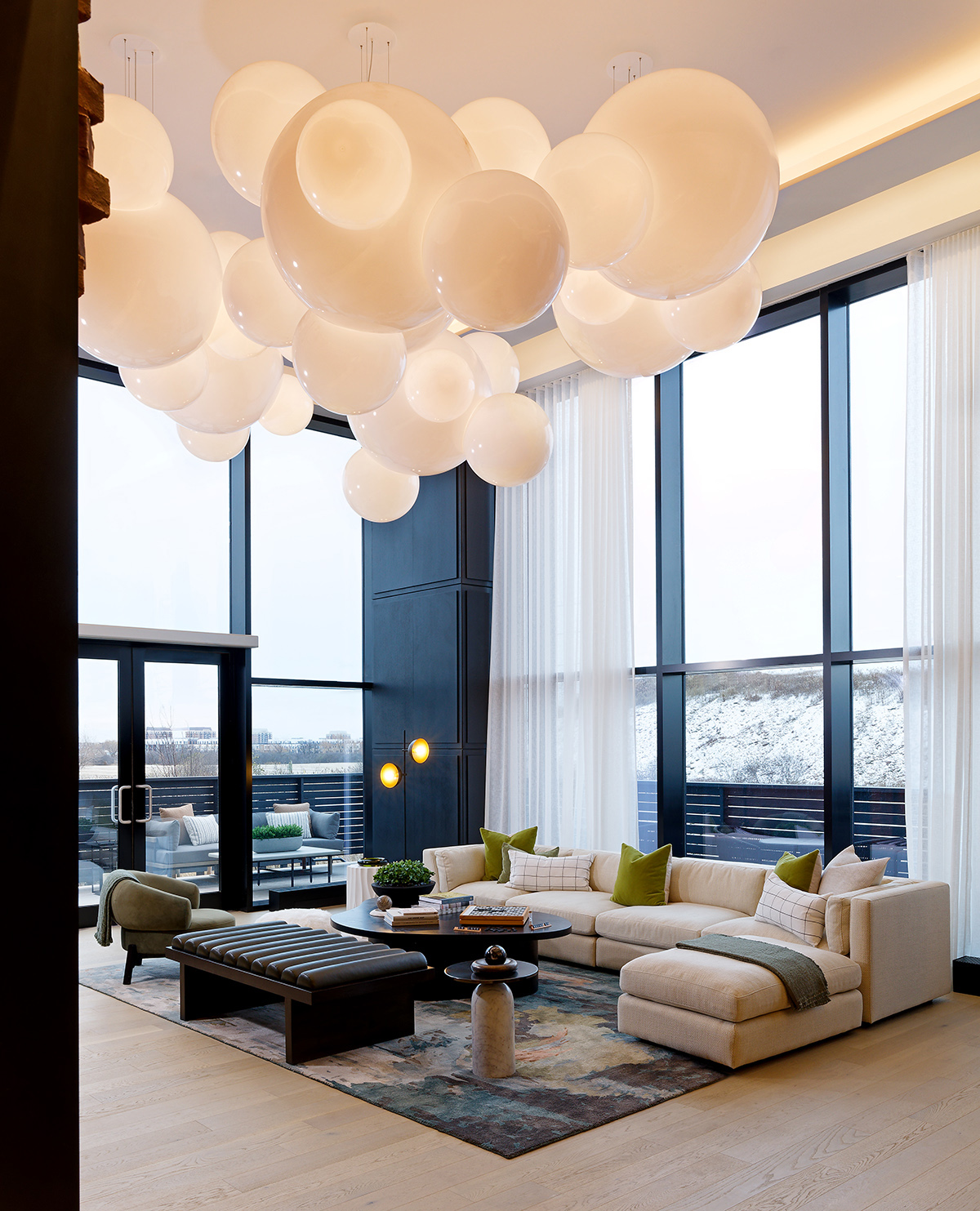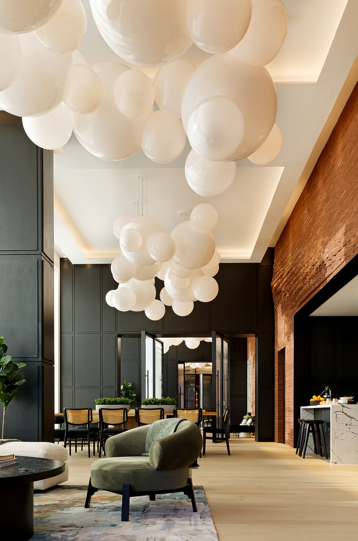 VISO undertook the design of lobby lighting, focusing on creating fixtures that contrasted distinctly with the lobby's industrial architecture. The core fixtures and sconces were meticulously crafted to achieve a seamless appearance, resembling clouds floating in a natural skyscape, with no light leakage. The design incorporated two different globe sizes, and a total of one hundred clusters were installed throughout the lobby.