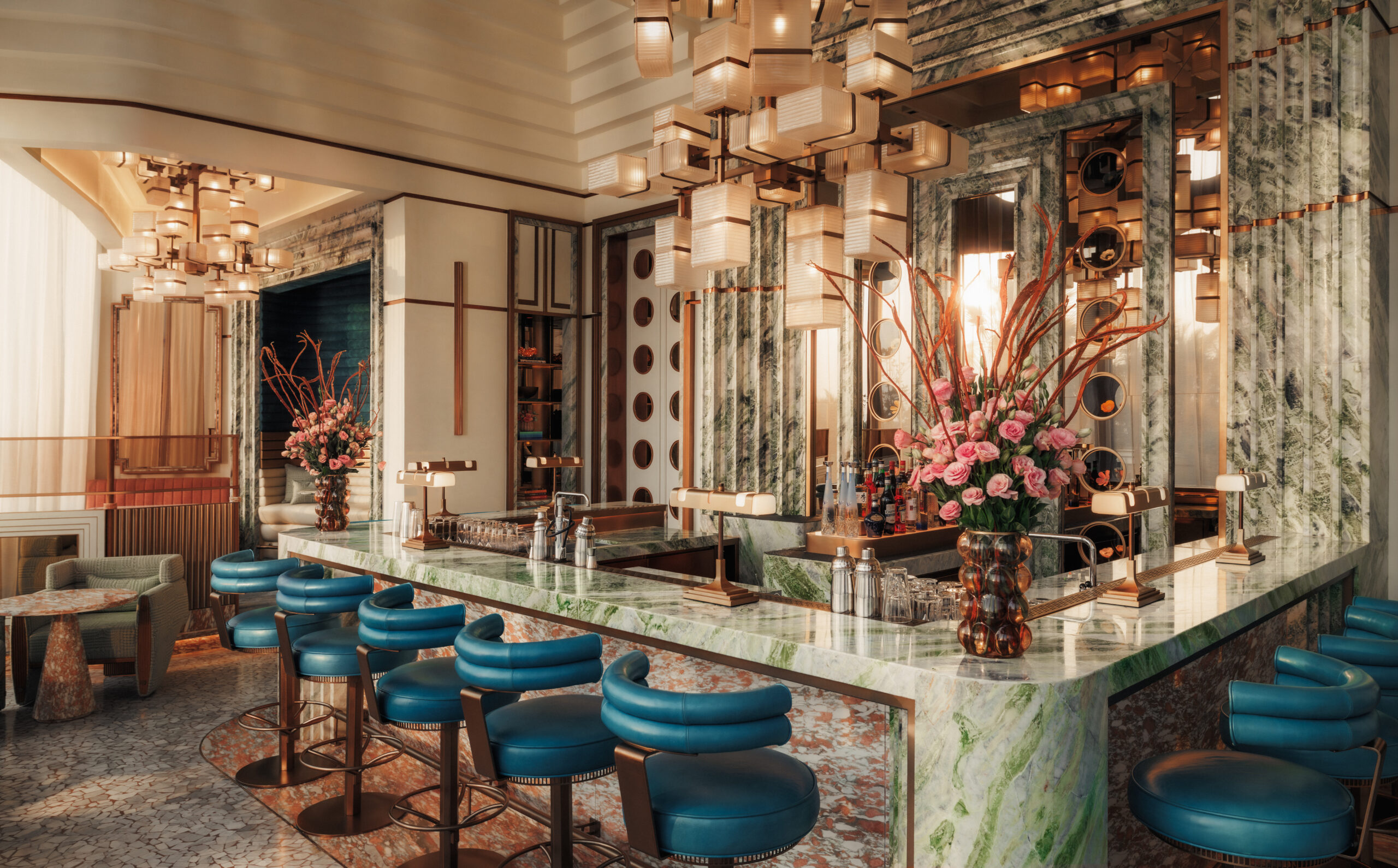 Conceived as an extension of the Italian Brasserie, The Bar channels the golden era of Italian design with clear nods to Carlo Scarpa’s architectural language. Stepped ceilings, layered geometries, and shifting spatial moments create a journey that moves guests from the expansive gallery into a series of more intimate, atmospheric environments.