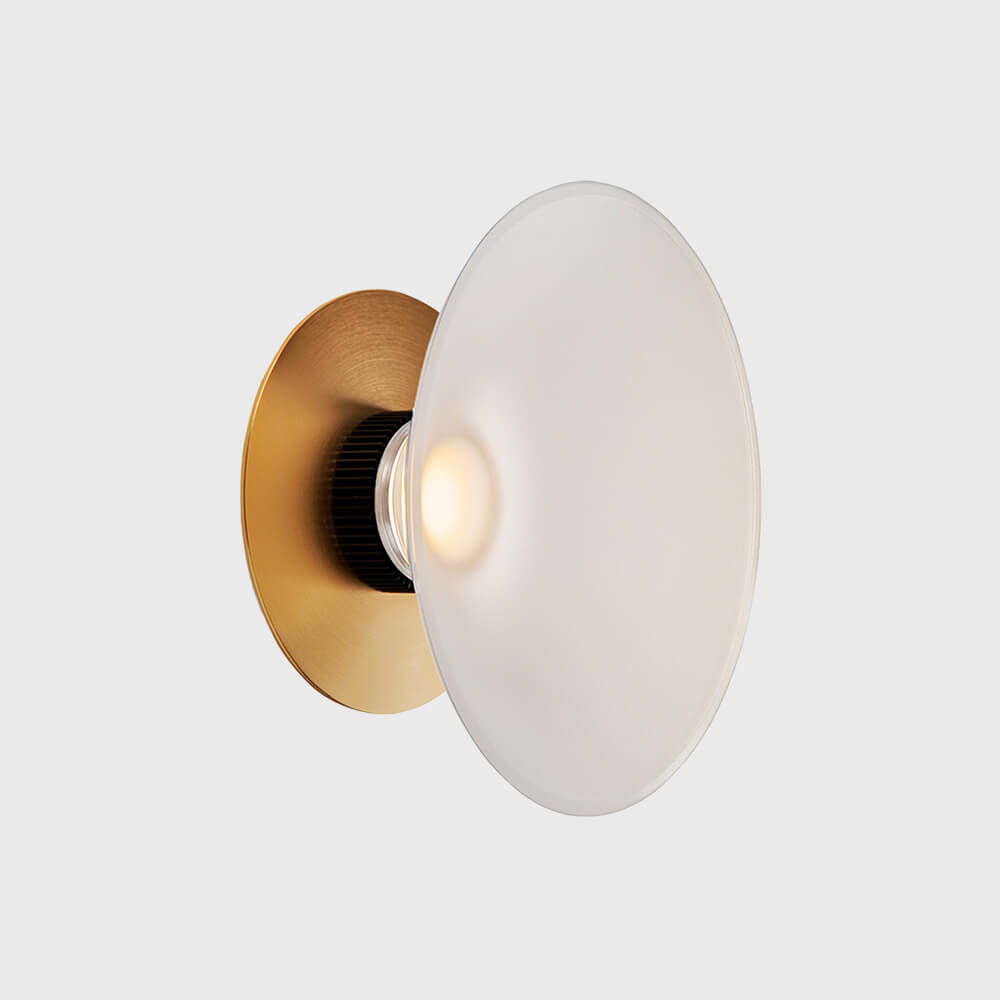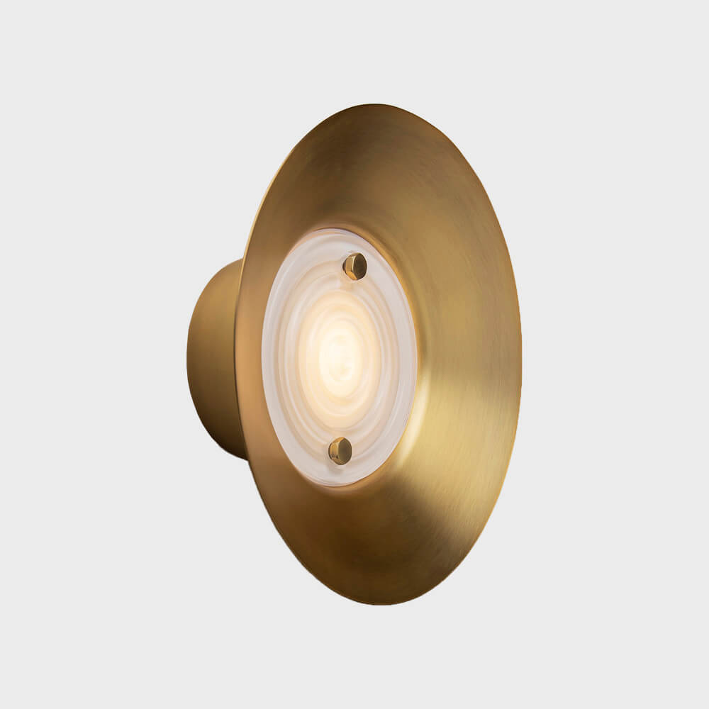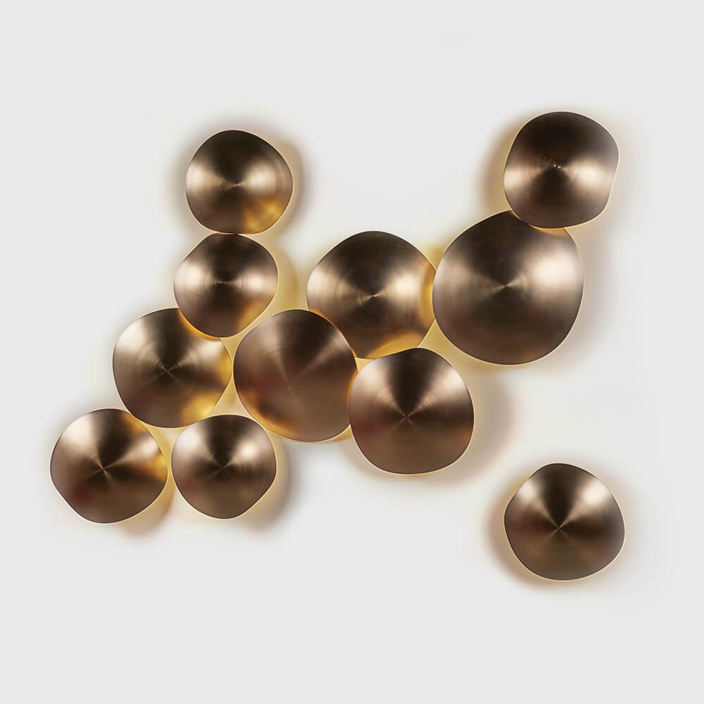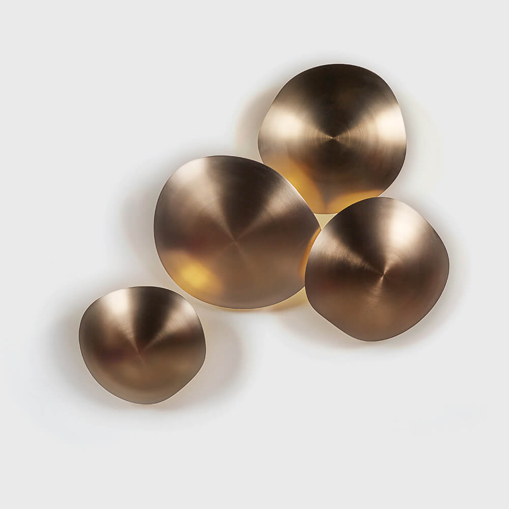 Metal light fixture with champagne finish. Fixture can be installed on the ceiling, as a wall sconce or used as decorative art