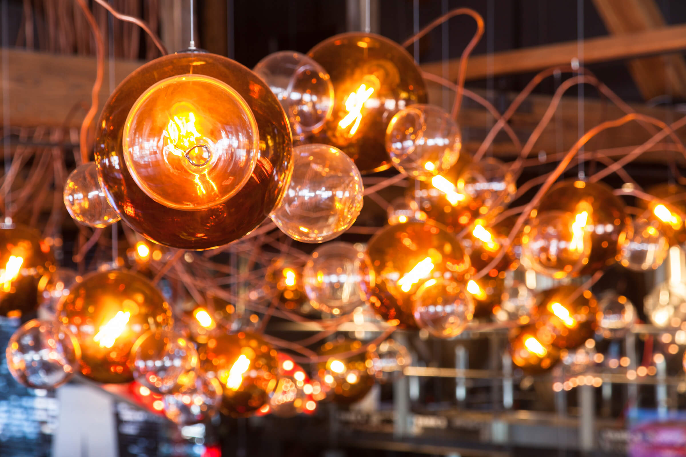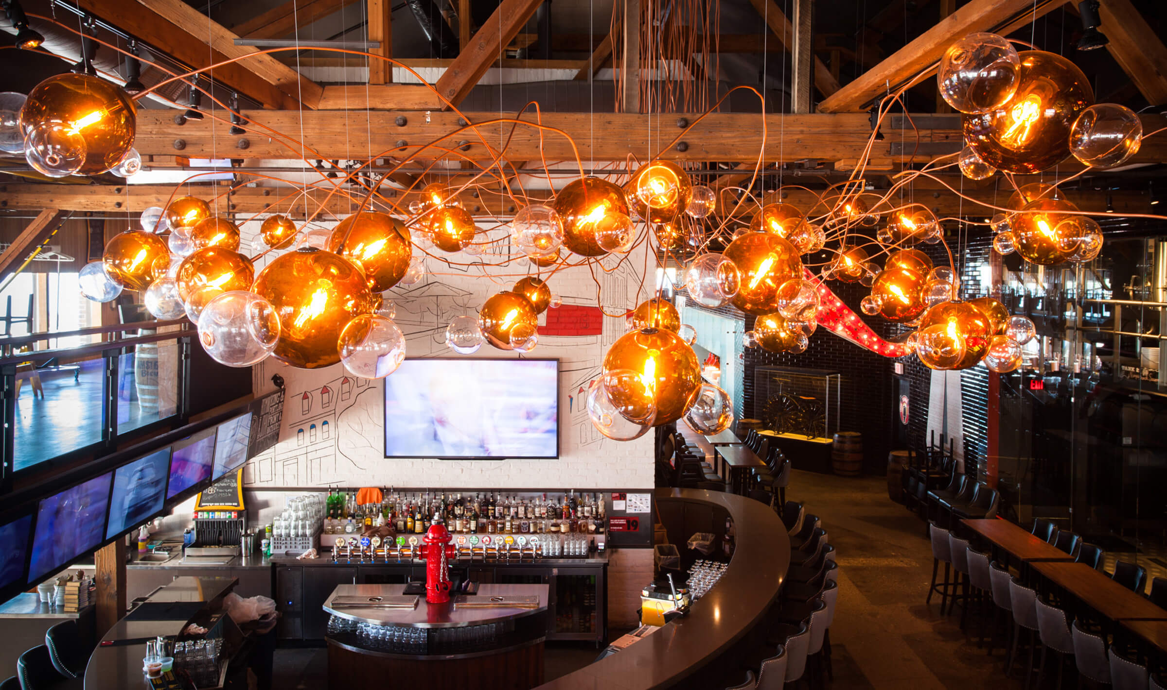 A hand-molded glass Maggie installation is shown as custom cluster canopy that brings a rustic chic vibe to the Amsterdam Brewhouse in Toronto.