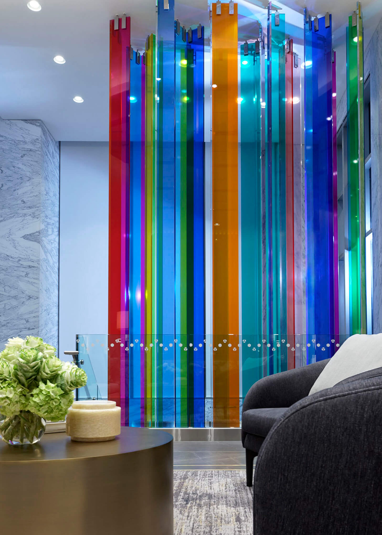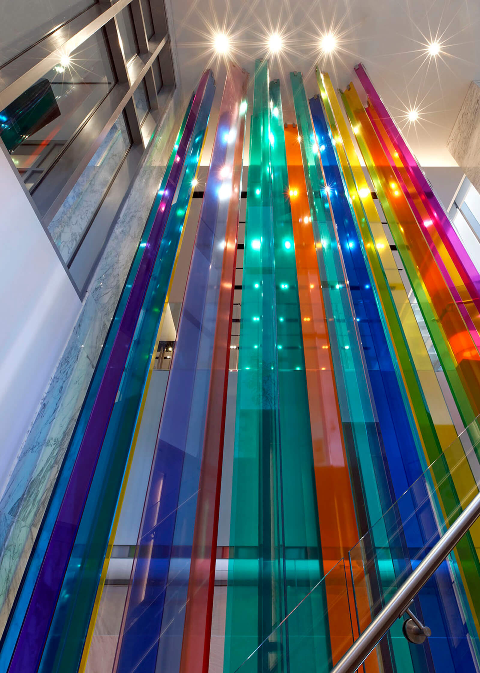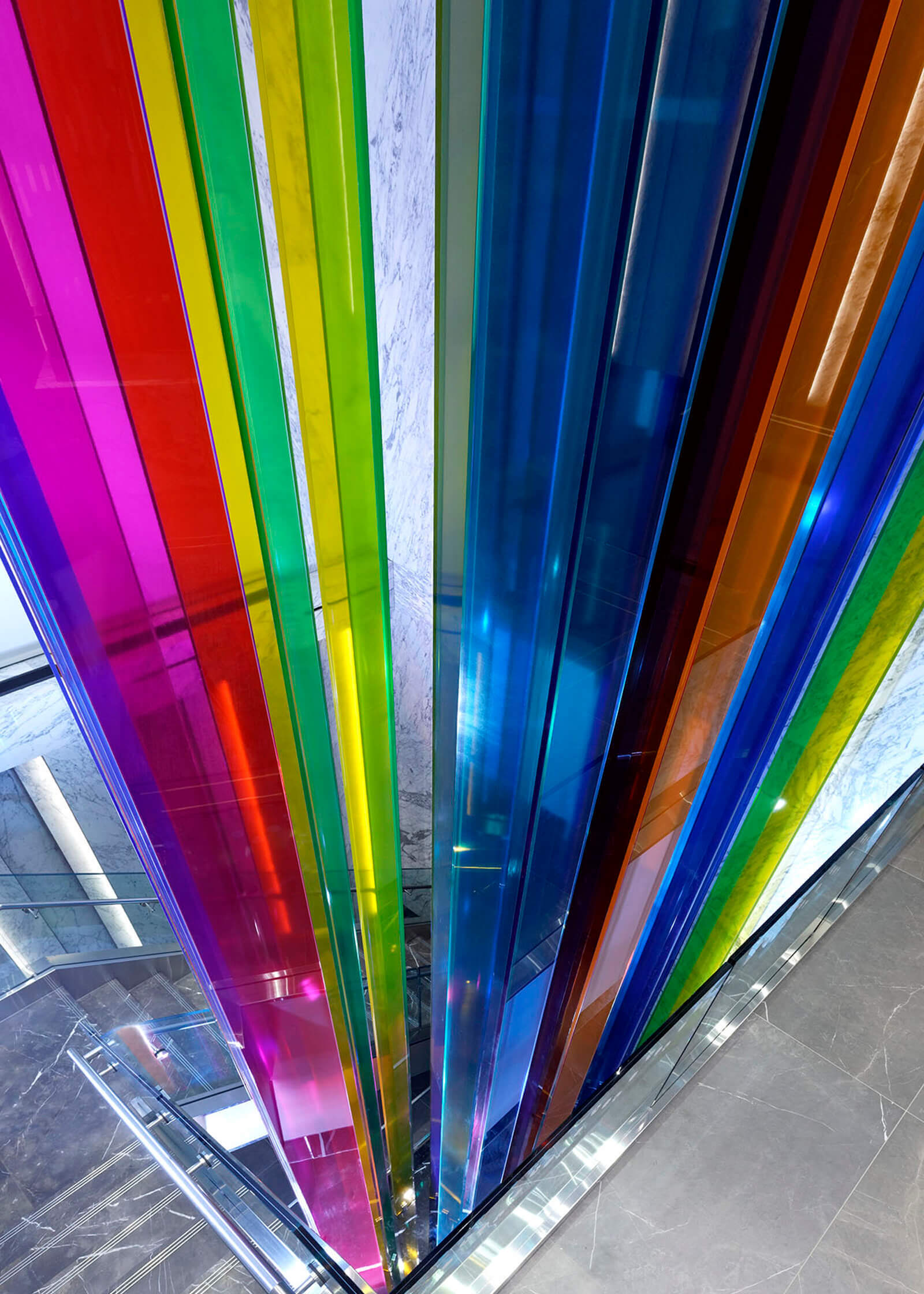 Refraction is a stunning addition to the art community where light uncovers that which is hidden in the shadow, gives life to the unseen and allows one to see clearly into the future…Innovative engineering and cutting-edge fabrication techniques were used to make the sixteen multicolour, 40-foot acrylic pillars, infused with different coloured film and secured by a 4” thick Nero Marquina stone.