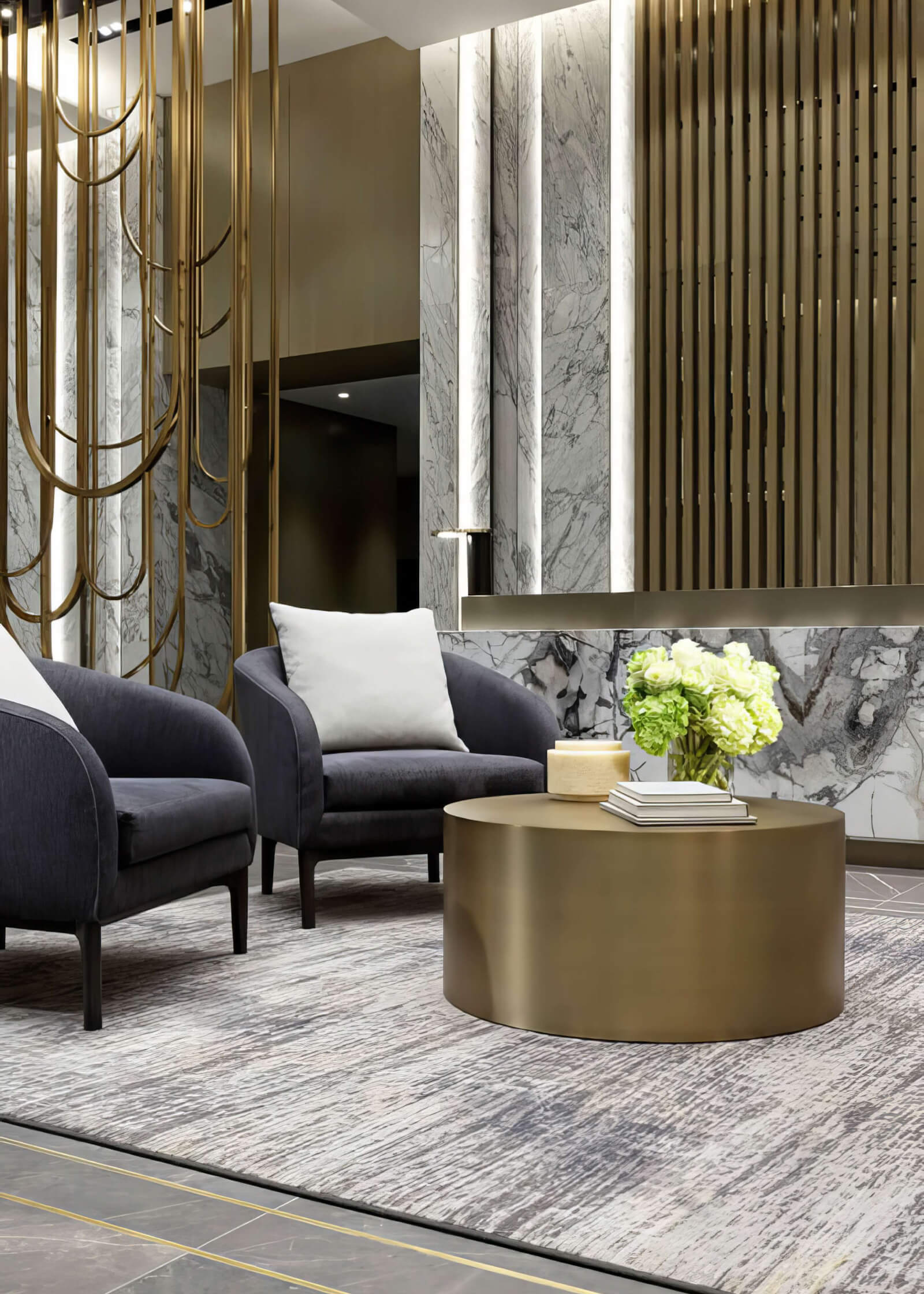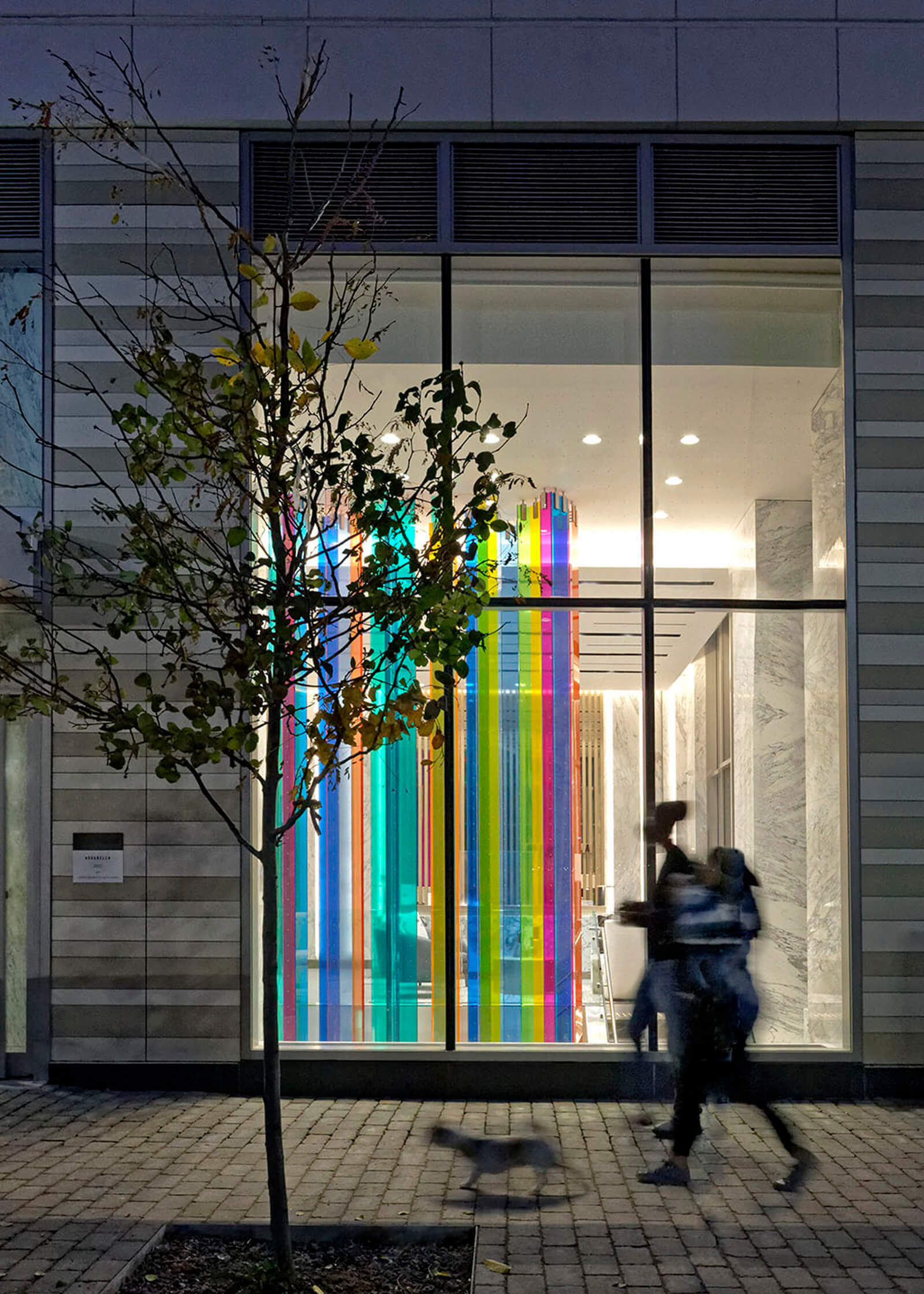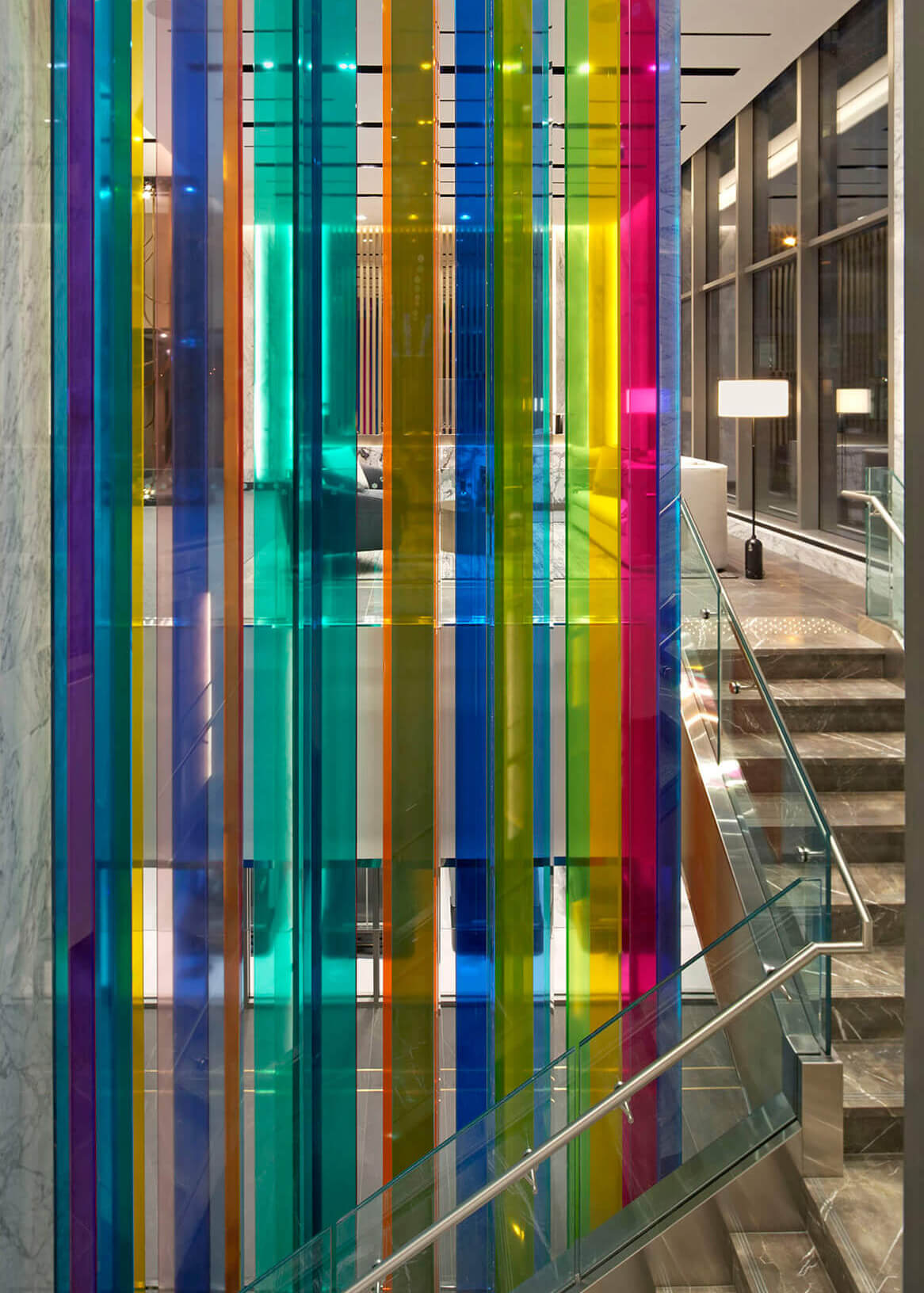 Refraction is a stunning addition to the art community where light uncovers that which is hidden in the shadow, gives life to the unseen and allows one to see clearly into the future…Innovative engineering and cutting-edge fabrication techniques were used to make the sixteen multicolour, 40-foot acrylic pillars, infused with different coloured film and secured by a 4” thick Nero Marquina stone.