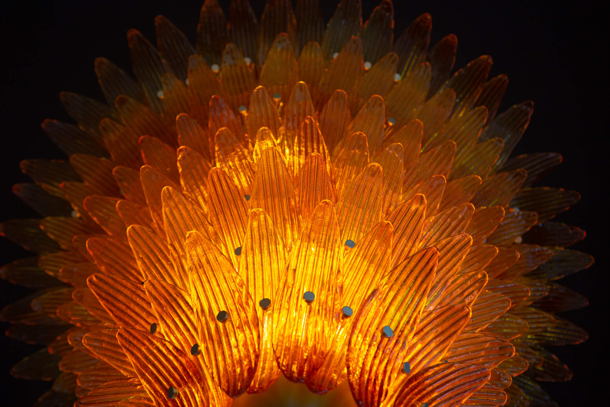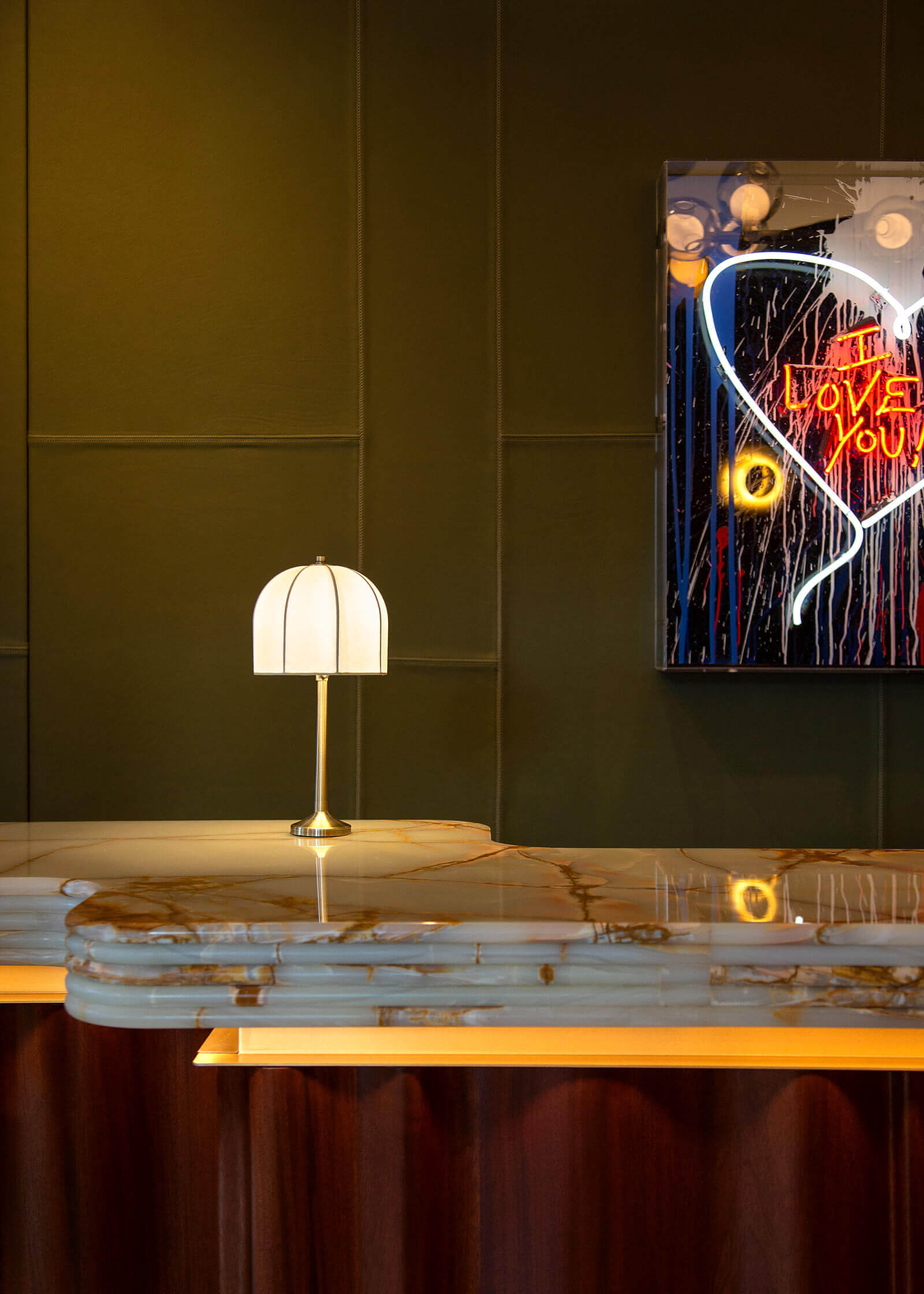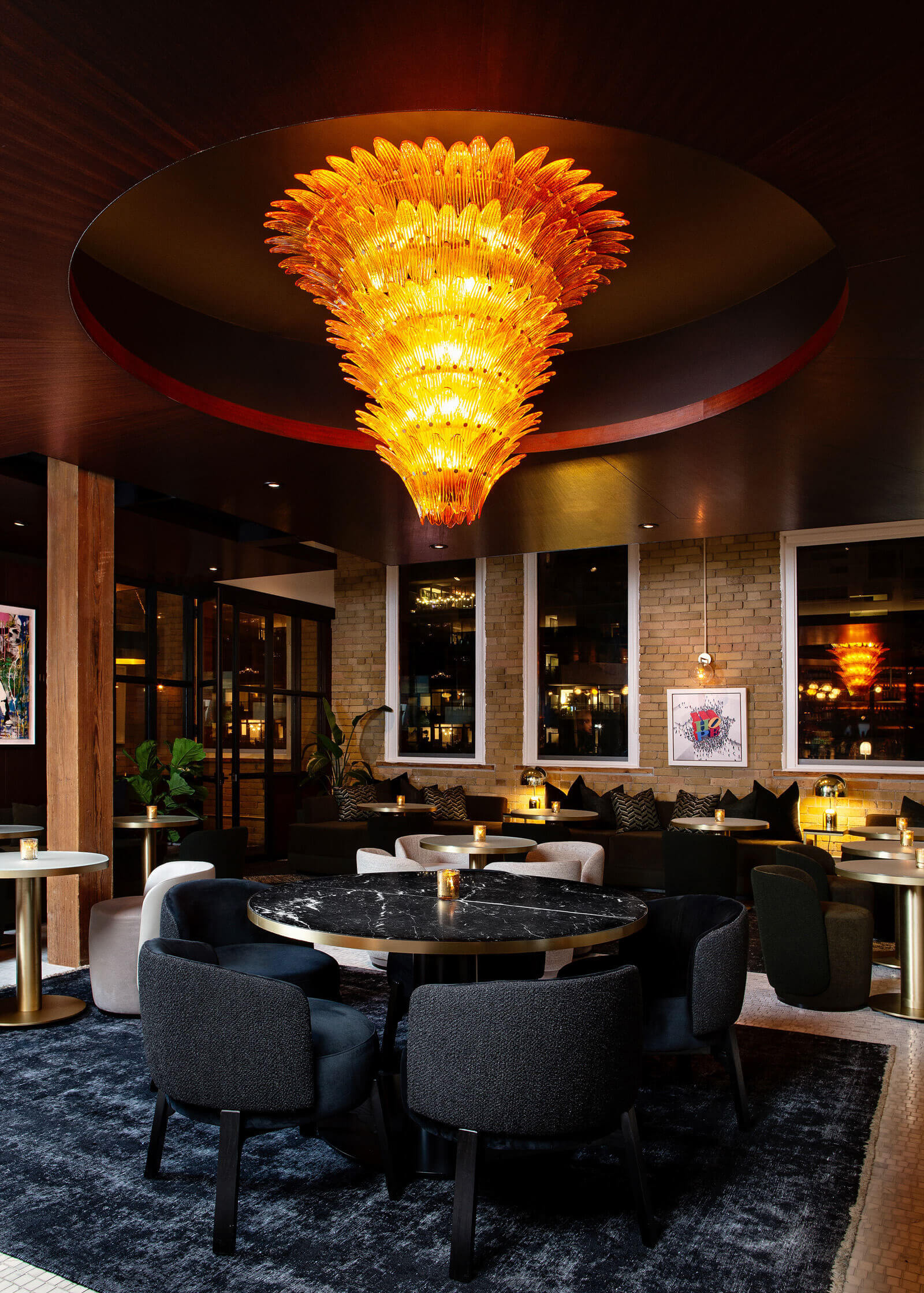 Members-Only Club Featuring a Layered Amber Chandelier by VISO