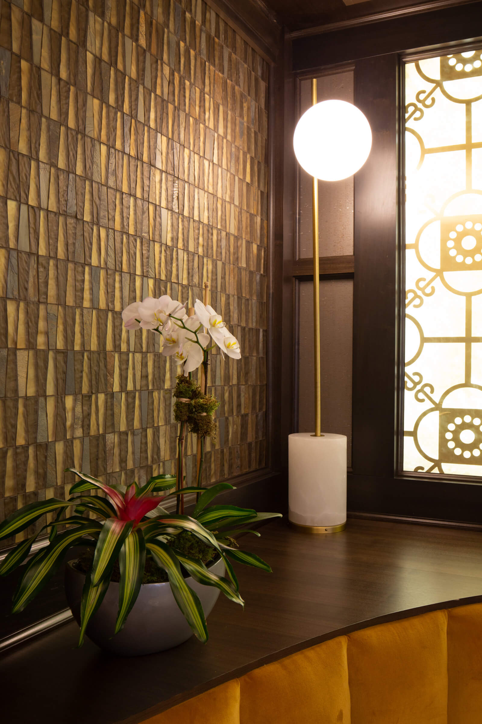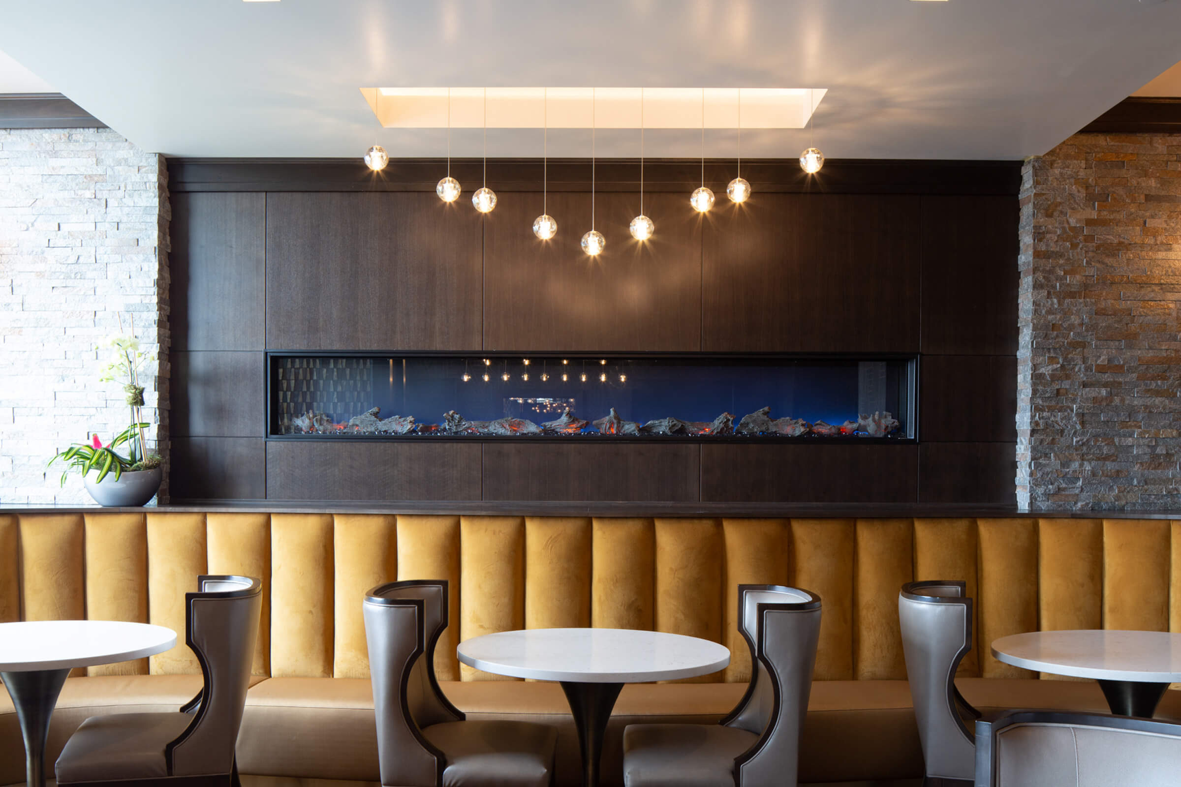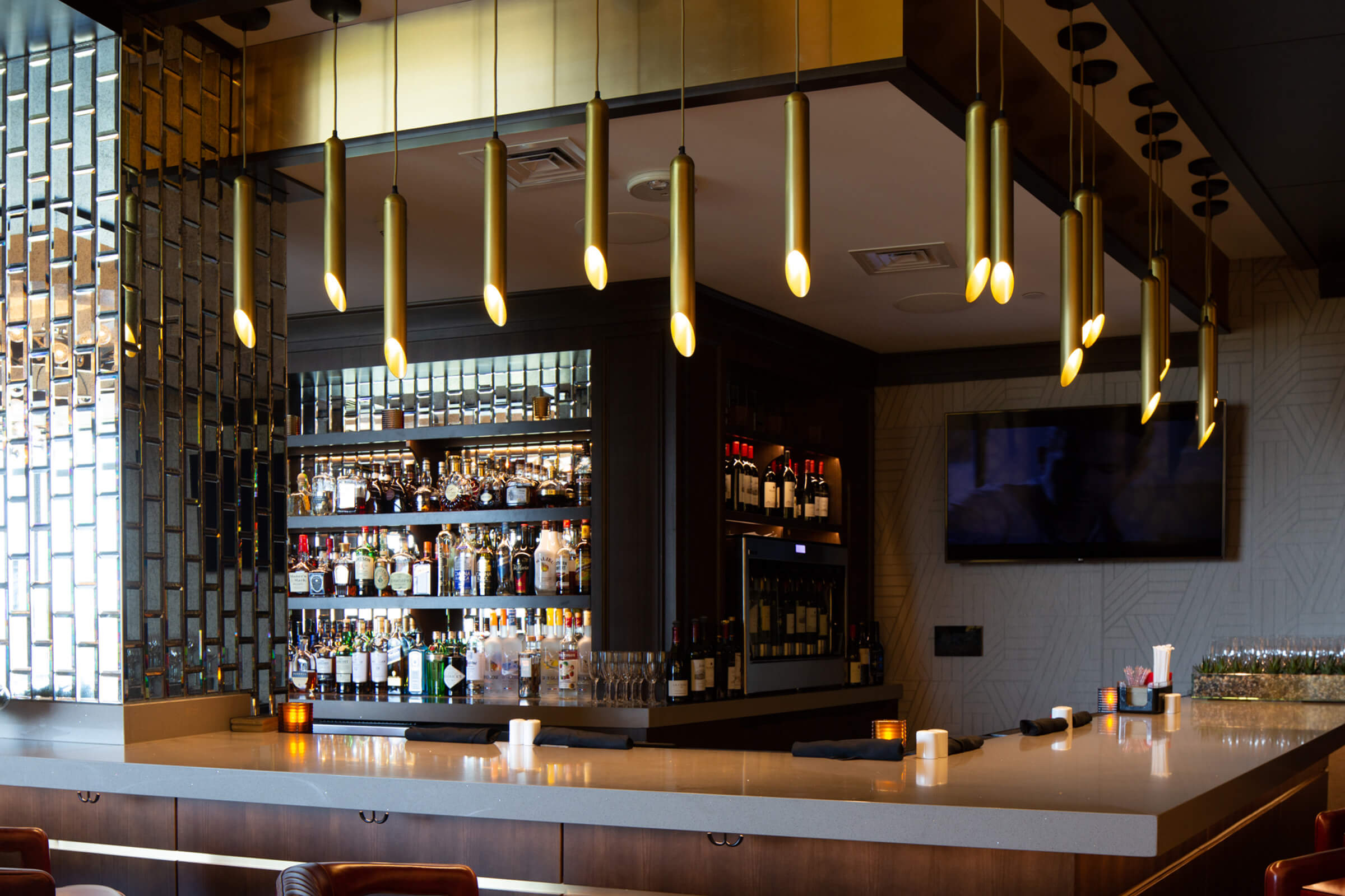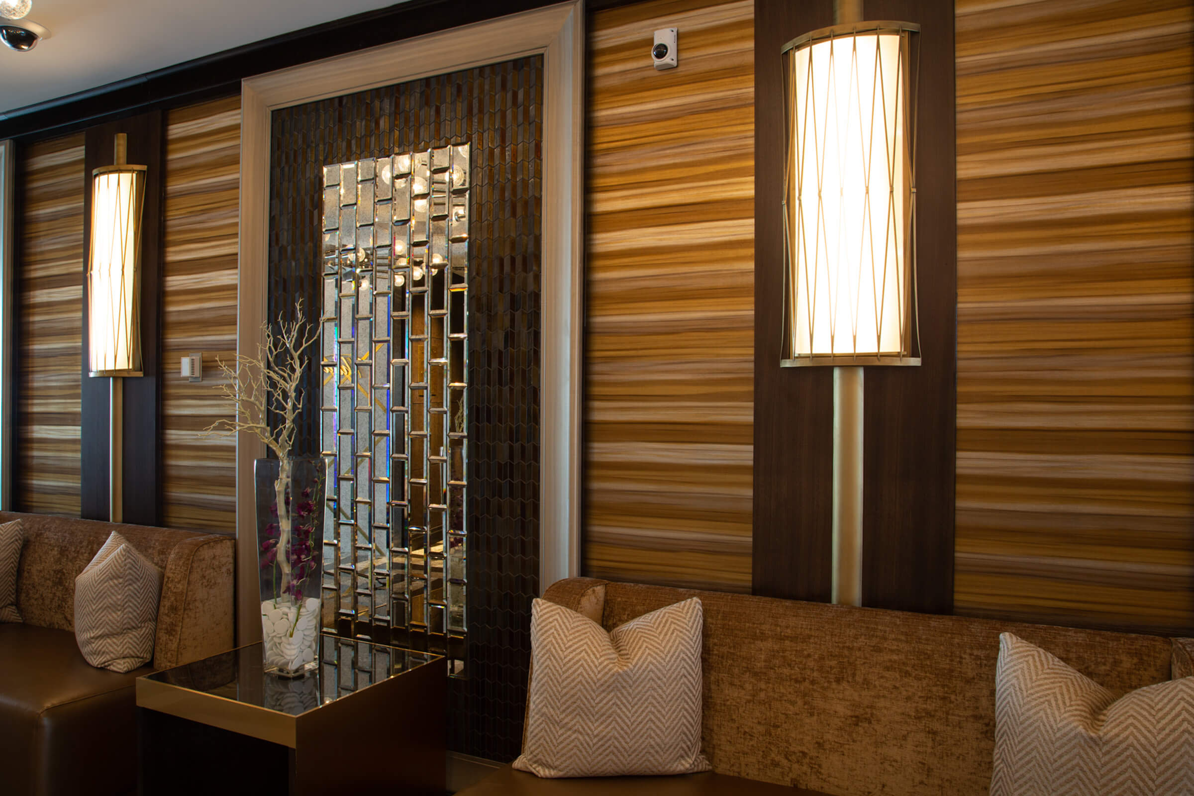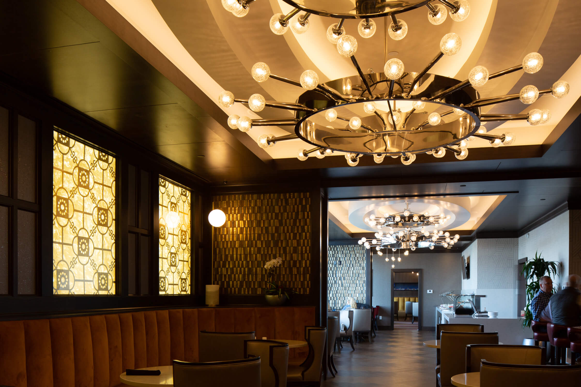 The Mohegan Sun Casino highlights custom VISO pieces from chandeliers to pendants brushed with a proprietary bronze and silver finish.