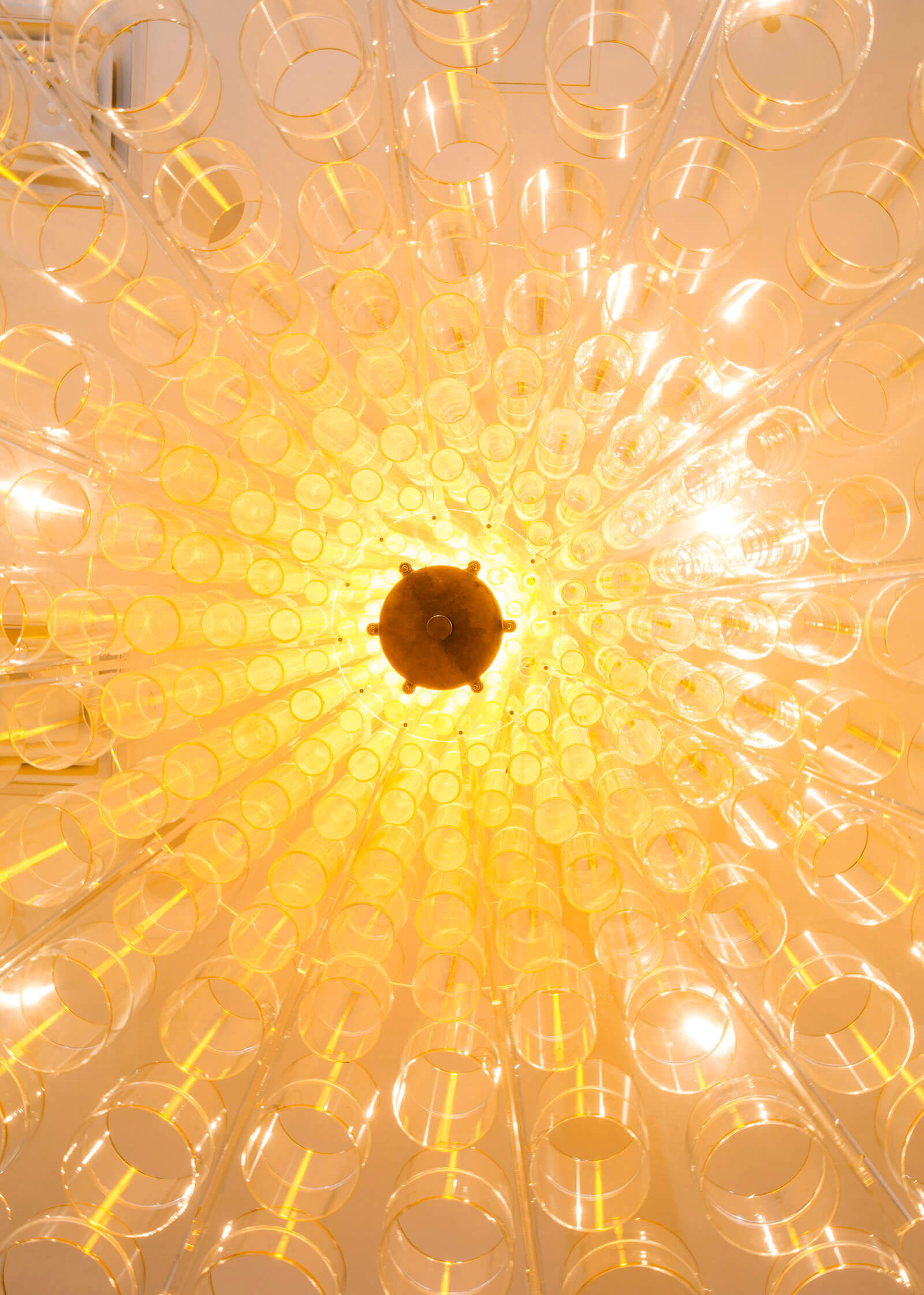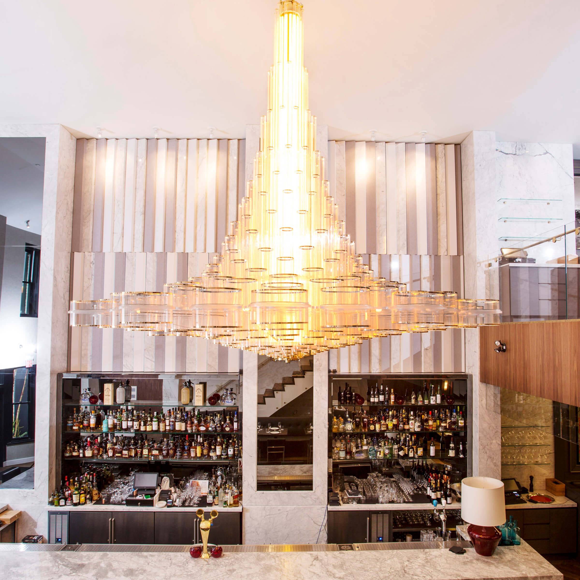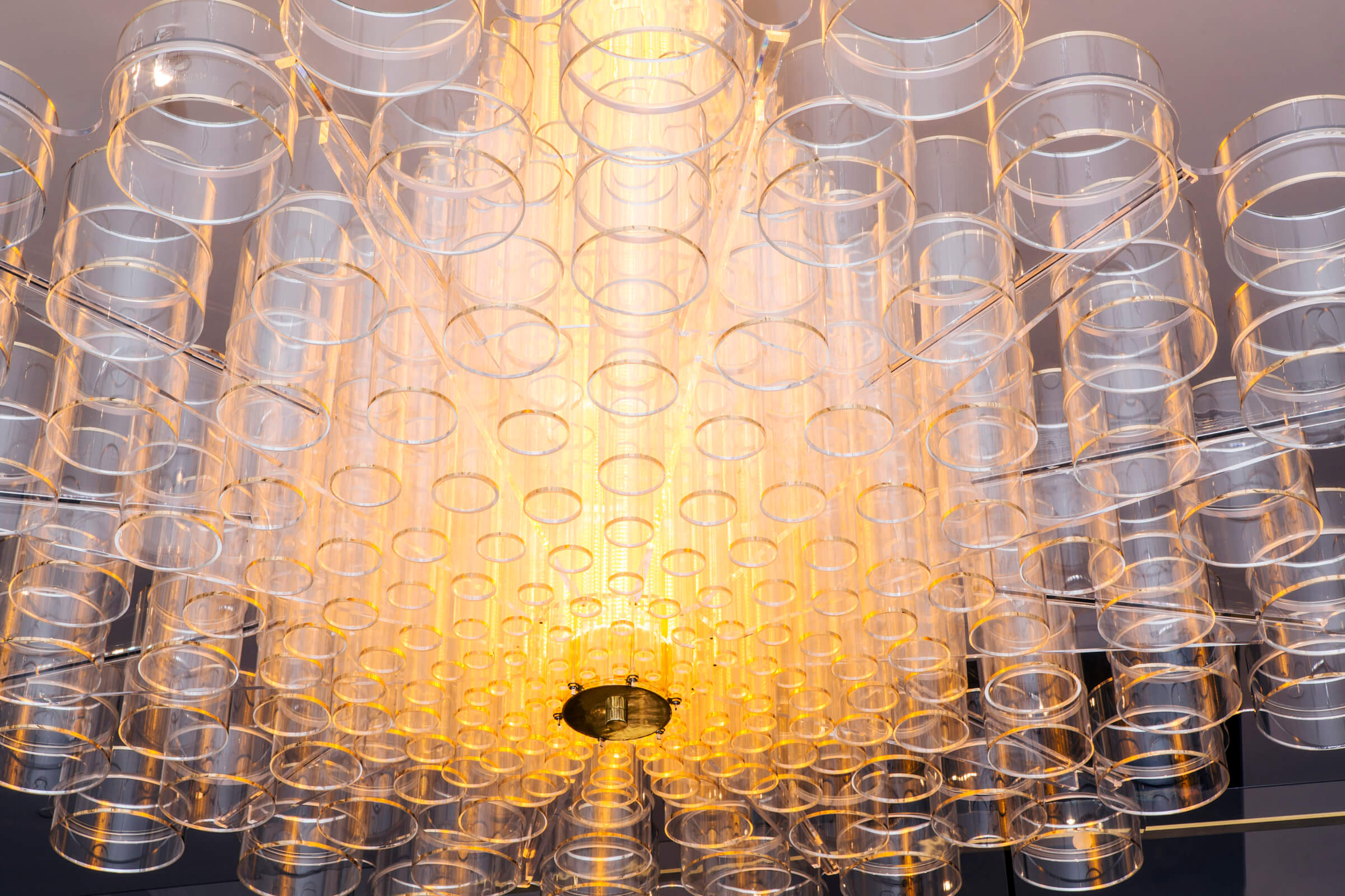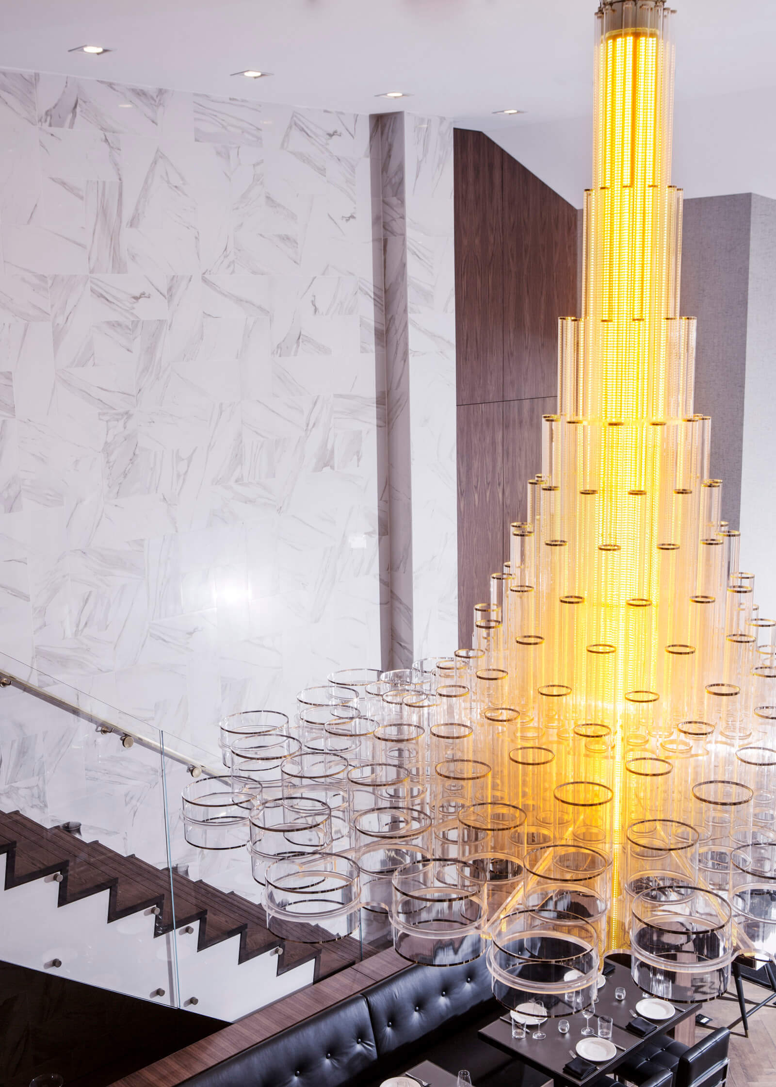 The VISO custom chandelier perfectly opens up the dining room in the Nao Steakhouse with its unique and radiant shape.