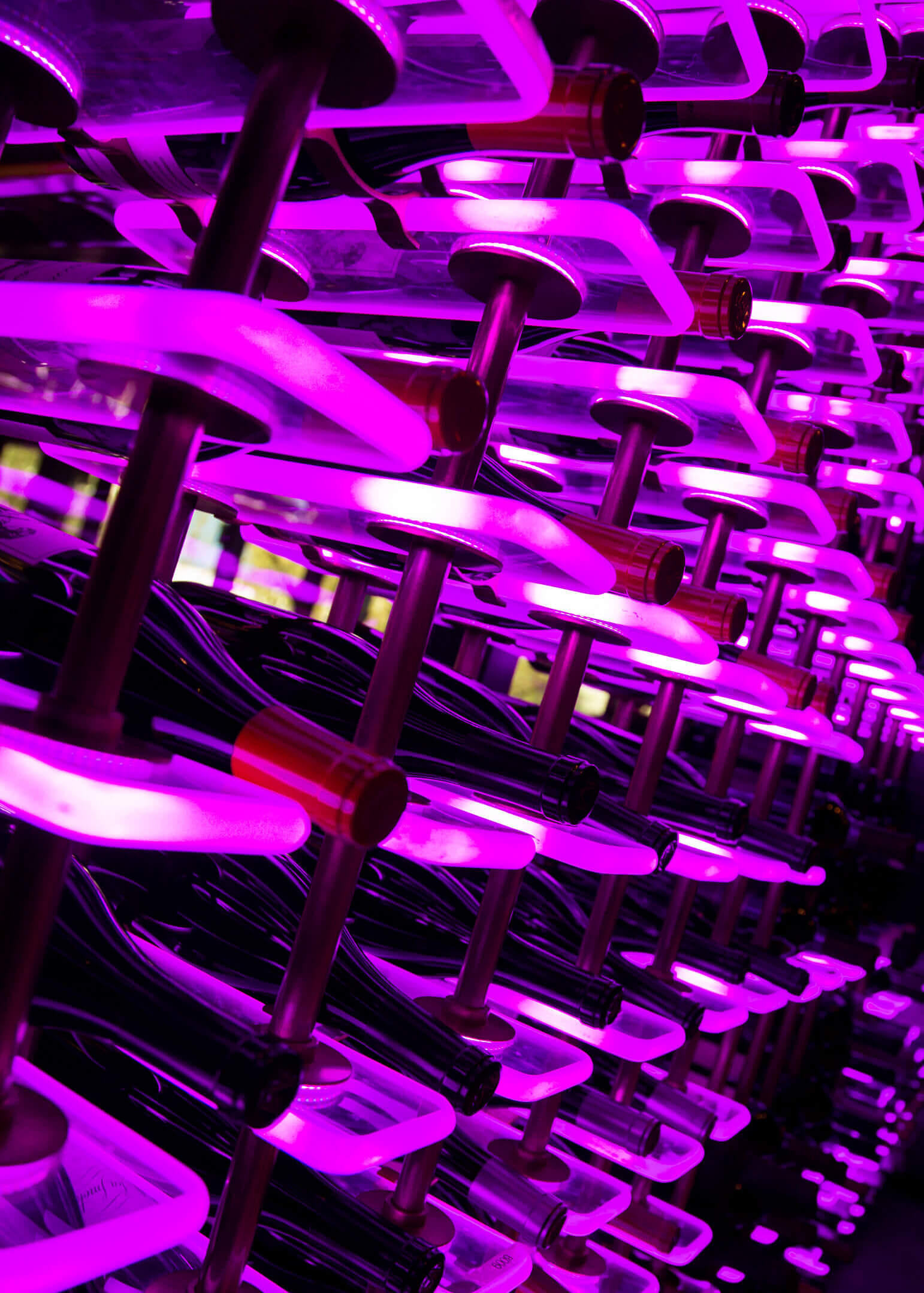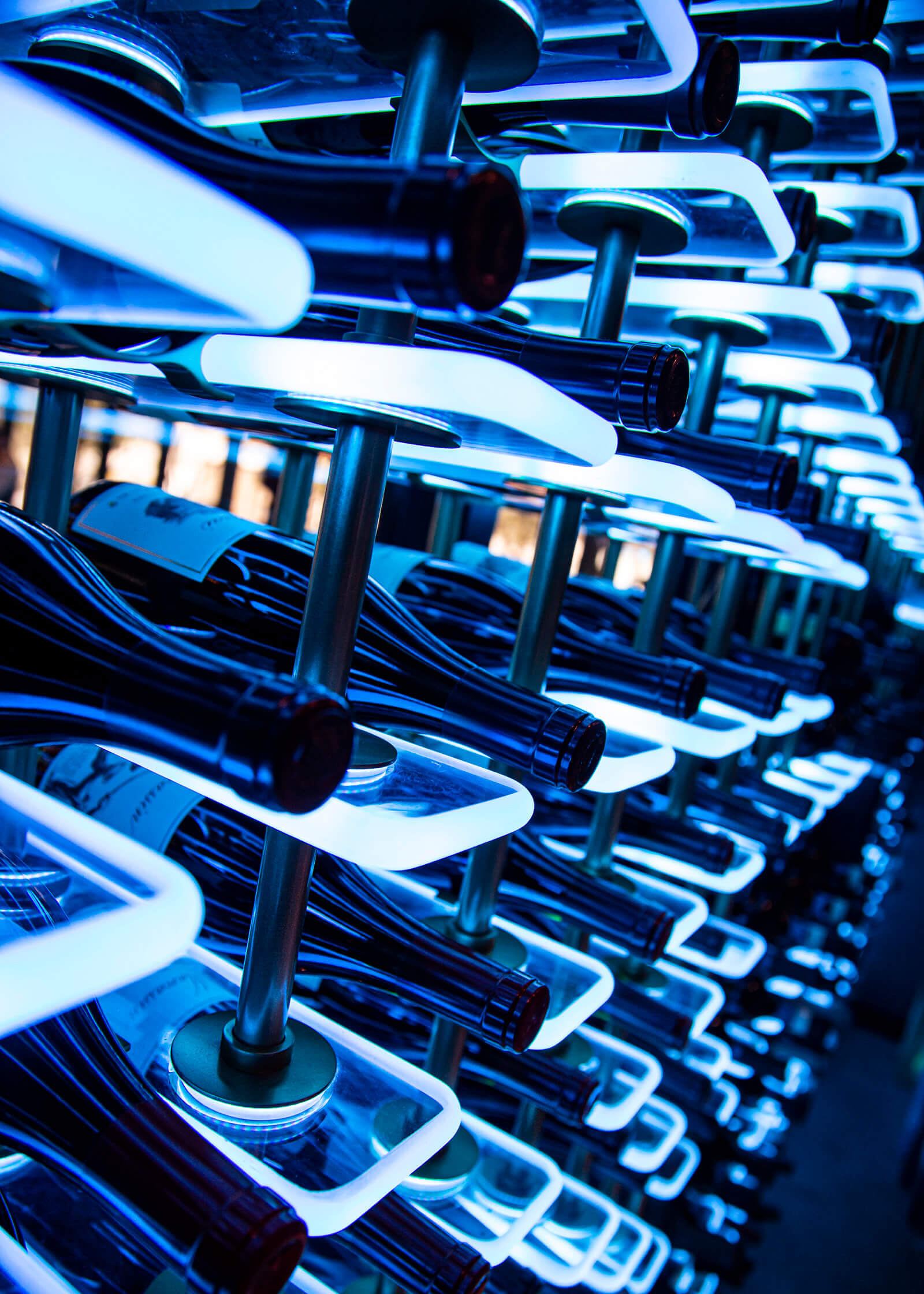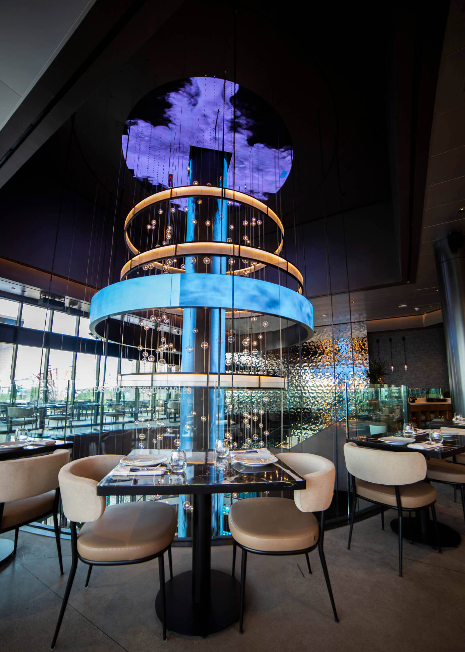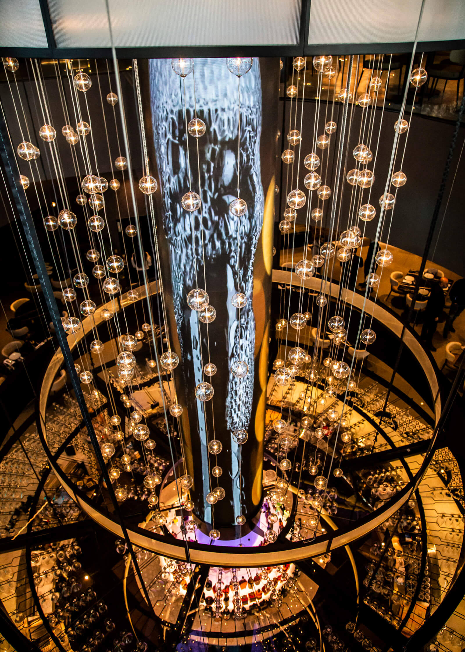 TPG architecture commissioned VISO to custom design-engineer, manufacture, install and program this one-of-a-kind feature decorative lighting installation for Nusr-Et restaurant in Las Vegas. Located next to the T-Mobile arena, Salt Bae is already attracting a crowd not only for chef's gold leaf steak. The impeccable atmosphere of the interior designed by TPG Architectire is the talk of the town. The custom decorative lighting installation features multiple LED screens, a column, rings and ceiling with the highest pixel quality LED screens, contemporary decorative crystal pendants and DMX controlled LEDs. VISO also designed, engineered, manufactured and installed a custom wine cellar display with DMX technology.