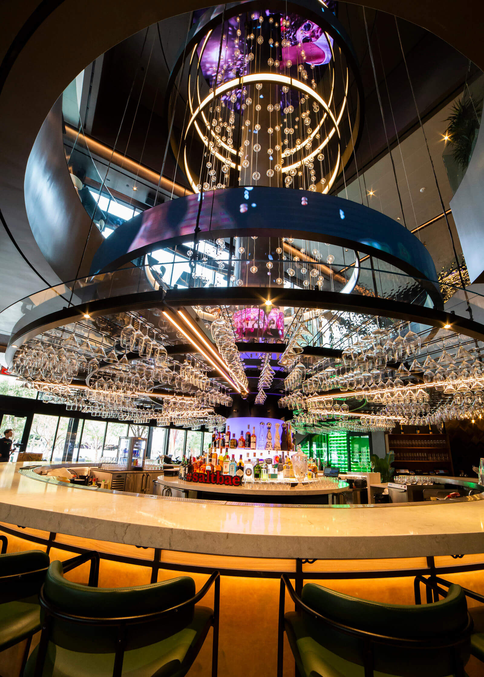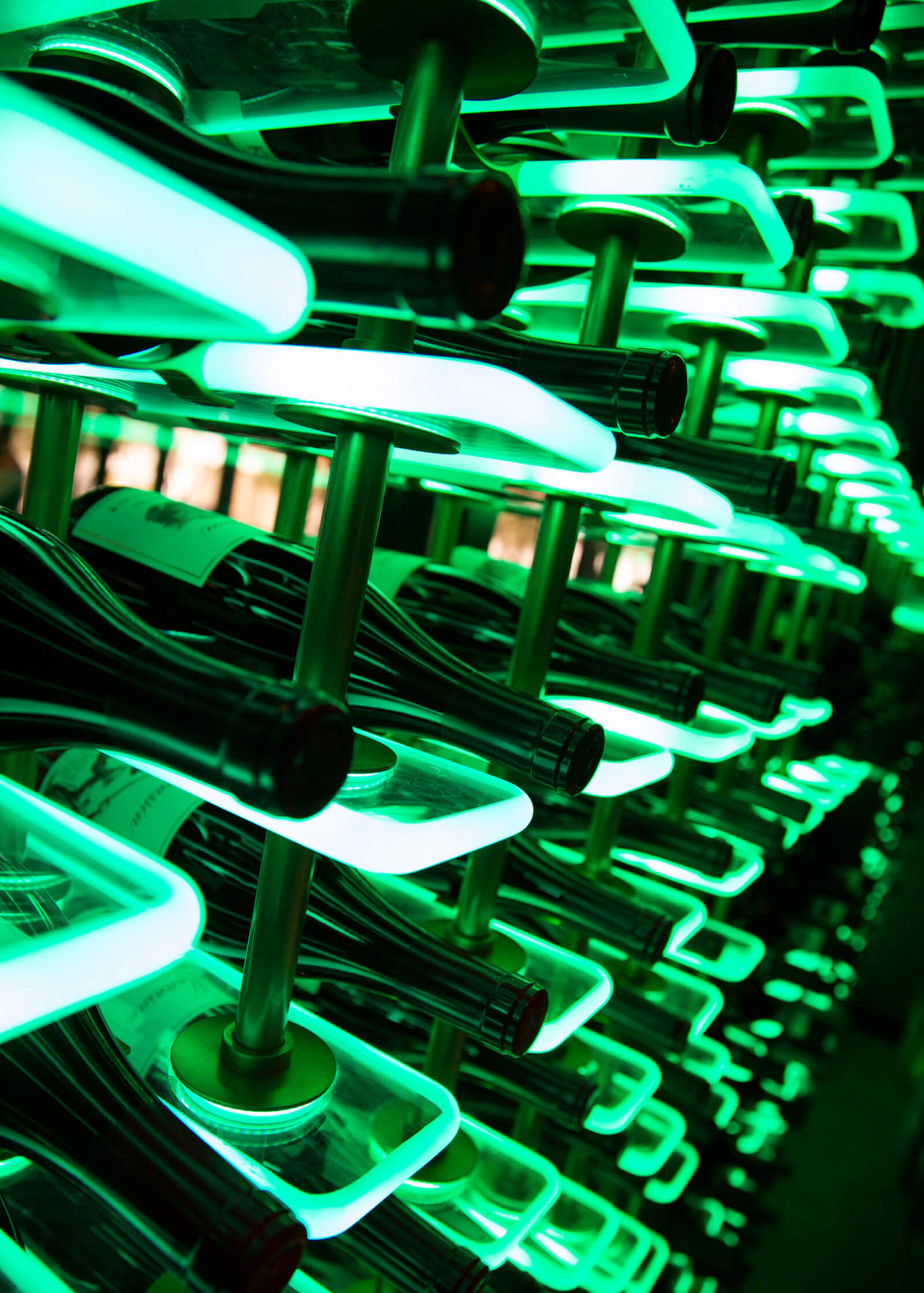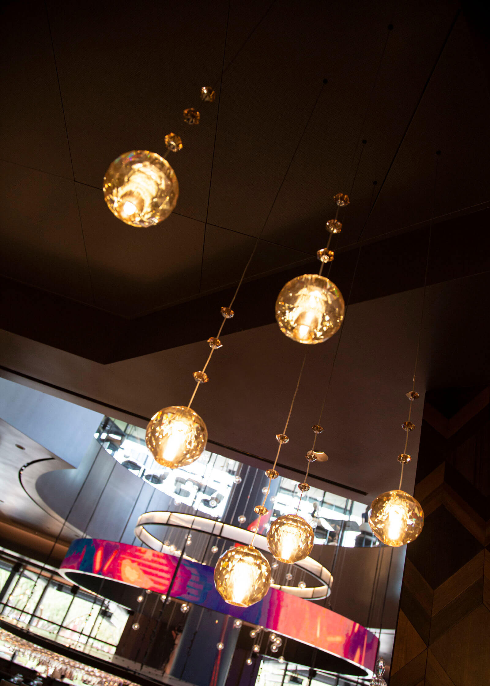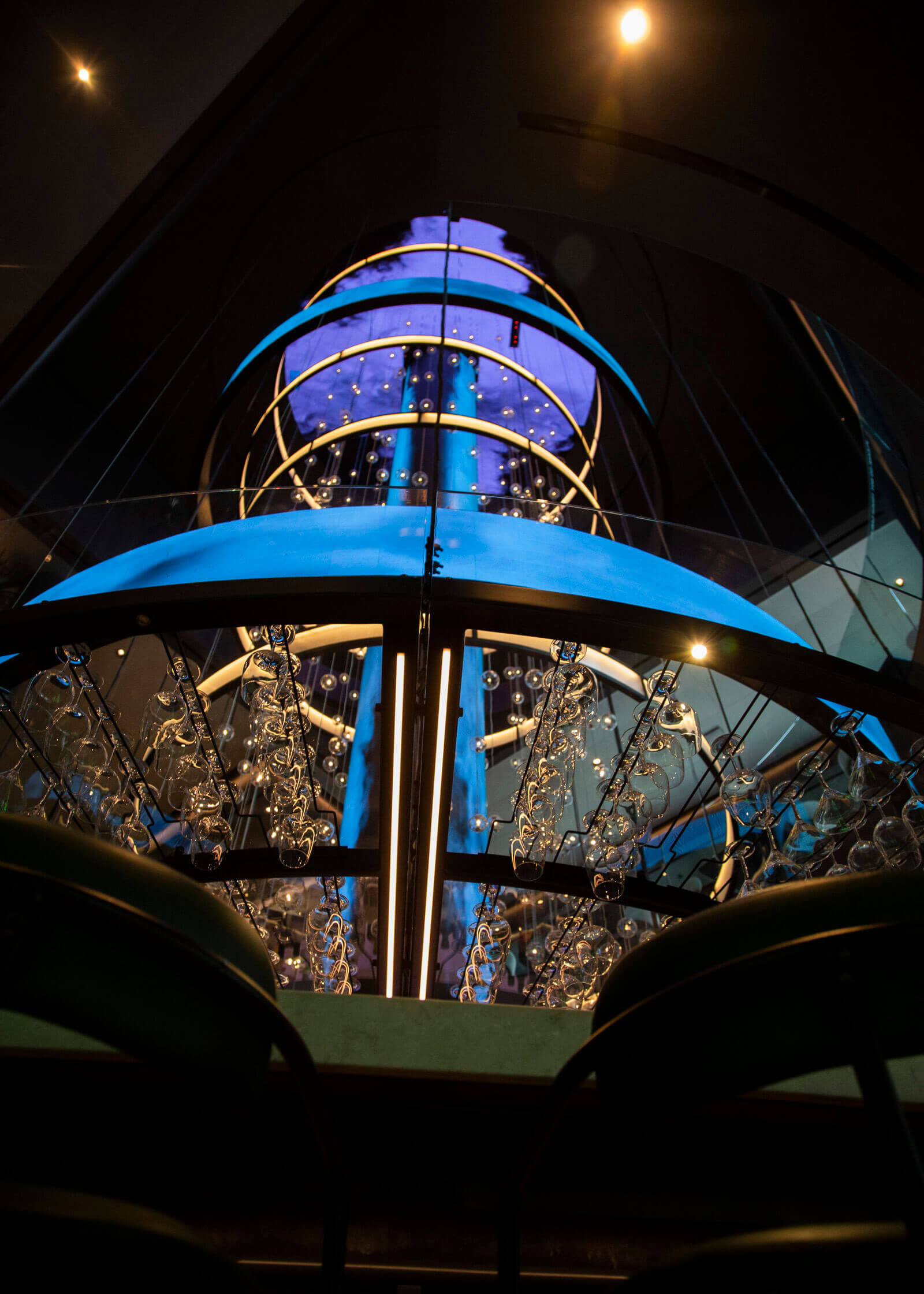 TPG architecture commissioned VISO to custom design-engineer, manufacture, install and program this one-of-a-kind feature decorative lighting installation for Nusr-Et restaurant in Las Vegas. Located next to the T-Mobile arena, Salt Bae is already attracting a crowd not only for chef's gold leaf steak. The impeccable atmosphere of the interior designed by TPG Architectire is the talk of the town. The custom decorative lighting installation features multiple LED screens, a column, rings and ceiling with the highest pixel quality LED screens, contemporary decorative crystal pendants and DMX controlled LEDs. VISO also designed, engineered, manufactured and installed a custom wine cellar display with DMX technology.
